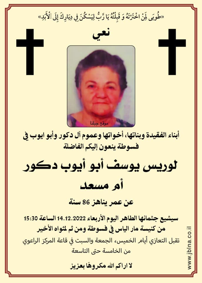 14 ديسمبر فسوطة- وفاة الفاضلة لوريس يوسف ابو ايوب-دكور- عن عمر يناهز 86 سنة من طرف : مصادر اخرى 2022-12-14 وفيات فسوطة- وفاة الفاضلة لوريس يوسف ابو ايوب-دكور- عن عمر يناهز 86 سنة