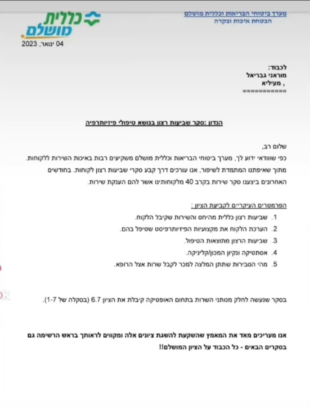 معهد العلاج الطبيعي لصاحبه جبرائيل موراني من معليا, يتربع في قمة استفتاء صندوق كلاليت بخصوص (إرضاء الجمهور)