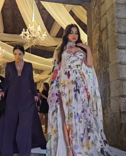 تألقت الفنانة اللبنانية هيفاء وهبي خلال حضورها حفل زفاف البلوجر غنى الغندور بفستان طويل (شيفون) مورد مفتوح مكشوف من منطقة الأكتاف والساق.