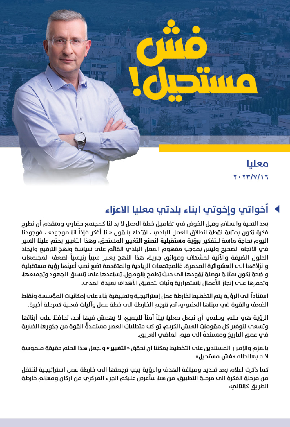 انتخابات السلطات المحلية 2023- معليا:(فش مستحيل), شعار مُرشح الرئاسة ايليا حنا عبد, وطرح رؤية مستقبلية لتحقيق التغيير