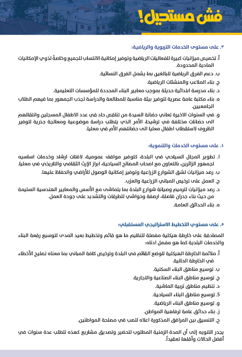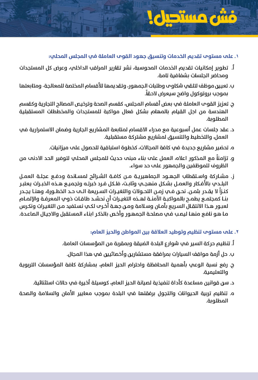 ز. مشاركة واستقطاب الجهود الجماهيرية من كافة الشرائح لمساندة ودفع عجلة العمل البلدي بالأفكار والعمل بشكل منهجي وثابت، فلكل فرد خبرته وتجميع هذه الخبرات يعتبر كنزاً لا يقدر بثمن. نحن في زمن التحولات والتغيرات السريعة الى حد الخطورة، وهنا يجدر بنا كمجتمع يطمح بالمواكبة الآمنة لهذه التغيرات أن نحشد طاقات ذوي المعرفة والإلمام لعبور هذا الانتقال السريع بأمان وسلامة ومن جهة أخرى لكي نستفيد من التغيرات ونكرس ما هو نافع منها ليصب في مصلحة الجمهور وأخص بالذكر ابناء المستقبل والاجيال الصاعدة.