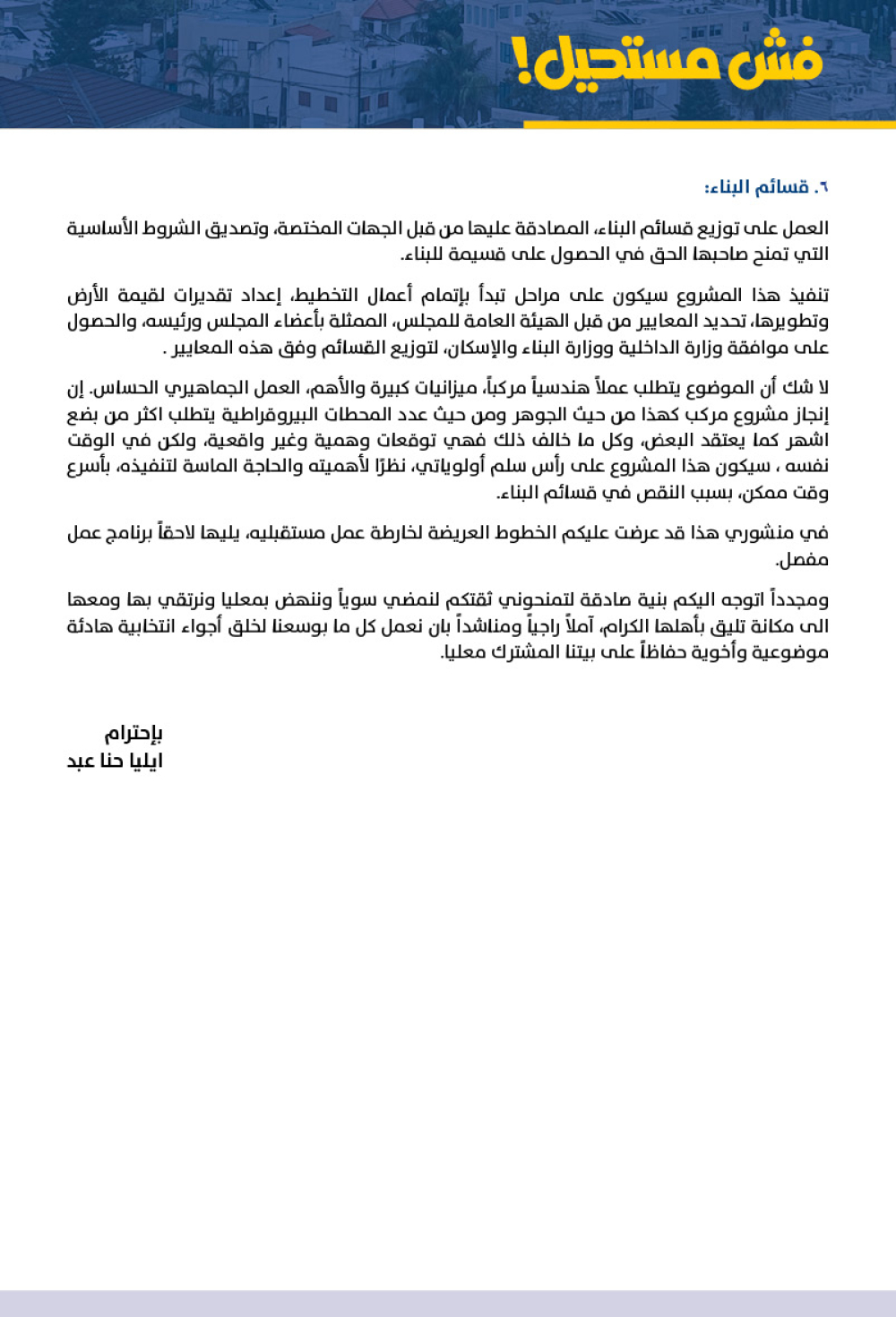اليكم البيان و برامج العمل الذي يطرحه المرشح ايليا حنا عبد: