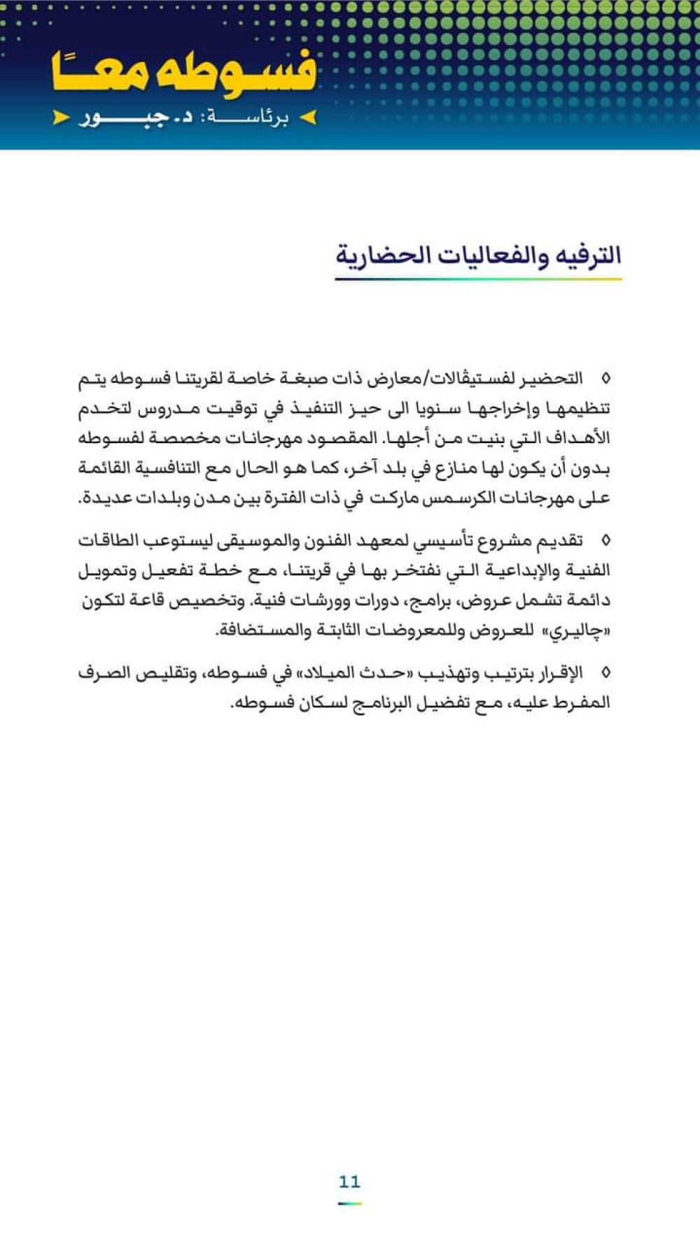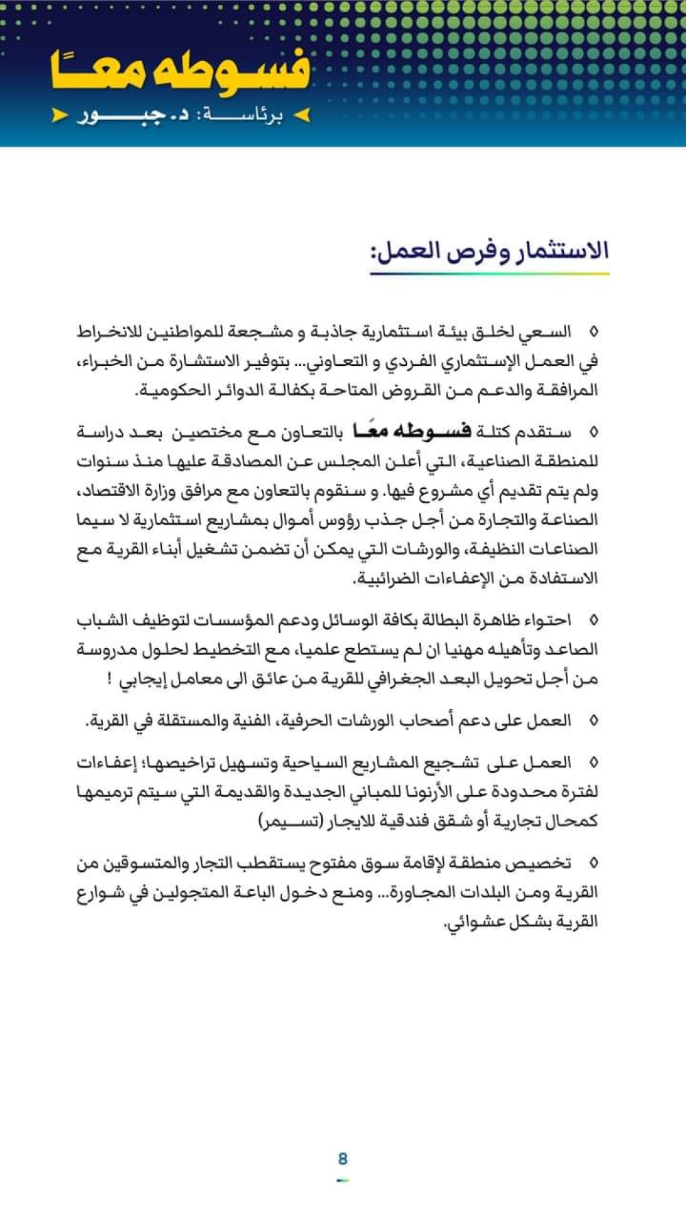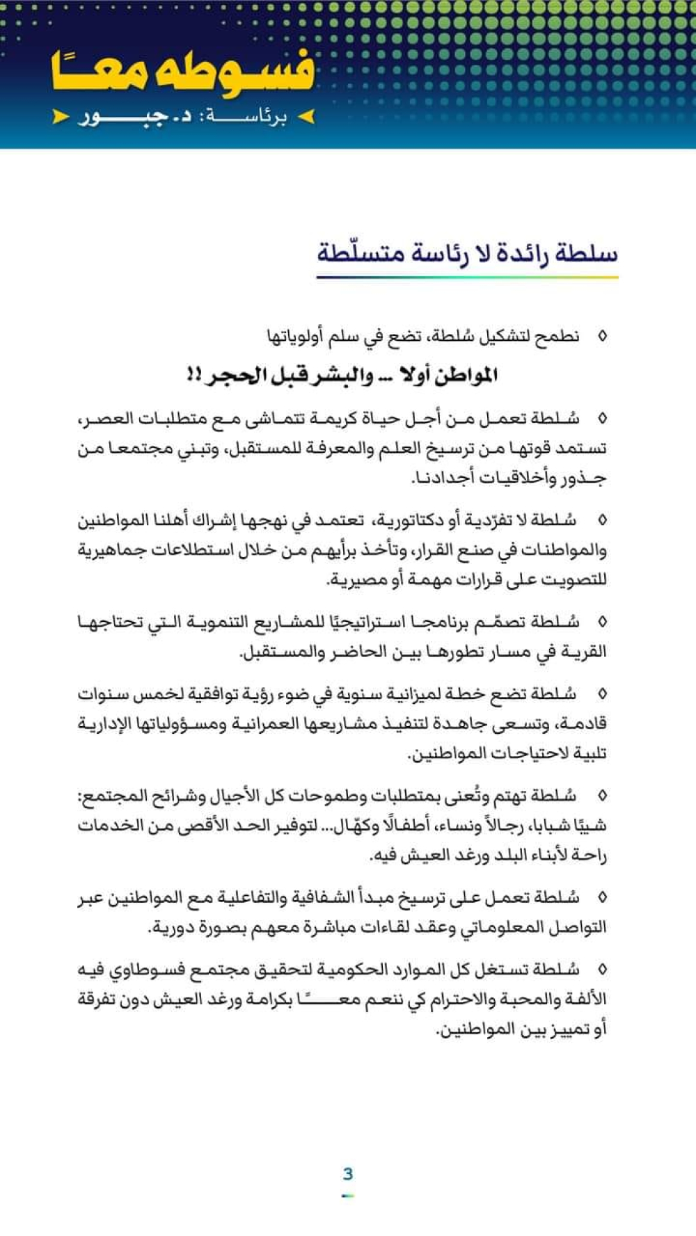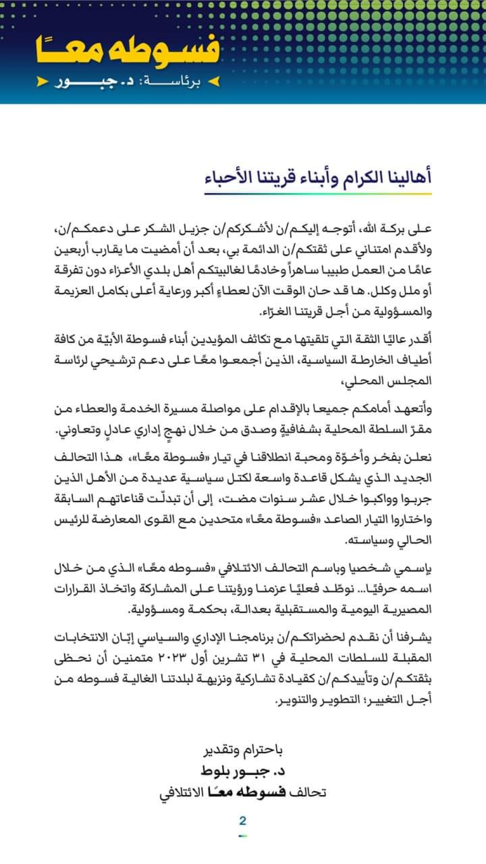 عمم الدكتور جبور بلوط اليوم الأربعاء بياًنا على أبناء بلدته فسوطة نحن شعار "فسوطة معًا", من خلاله برامج عمل مُفصل وواضح في جميع الأطر والمجالات في حال وصوله لمنصب رئاسة مجلس فسوطة.