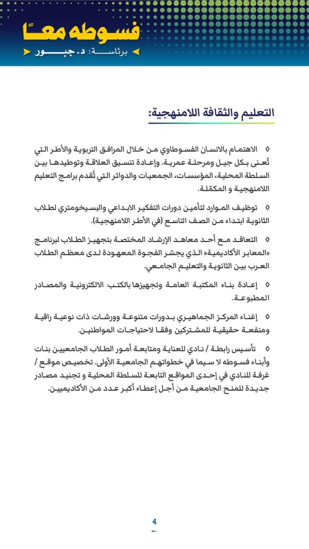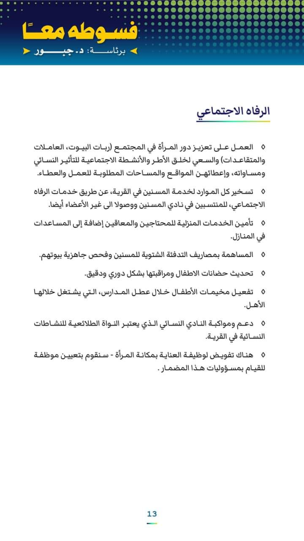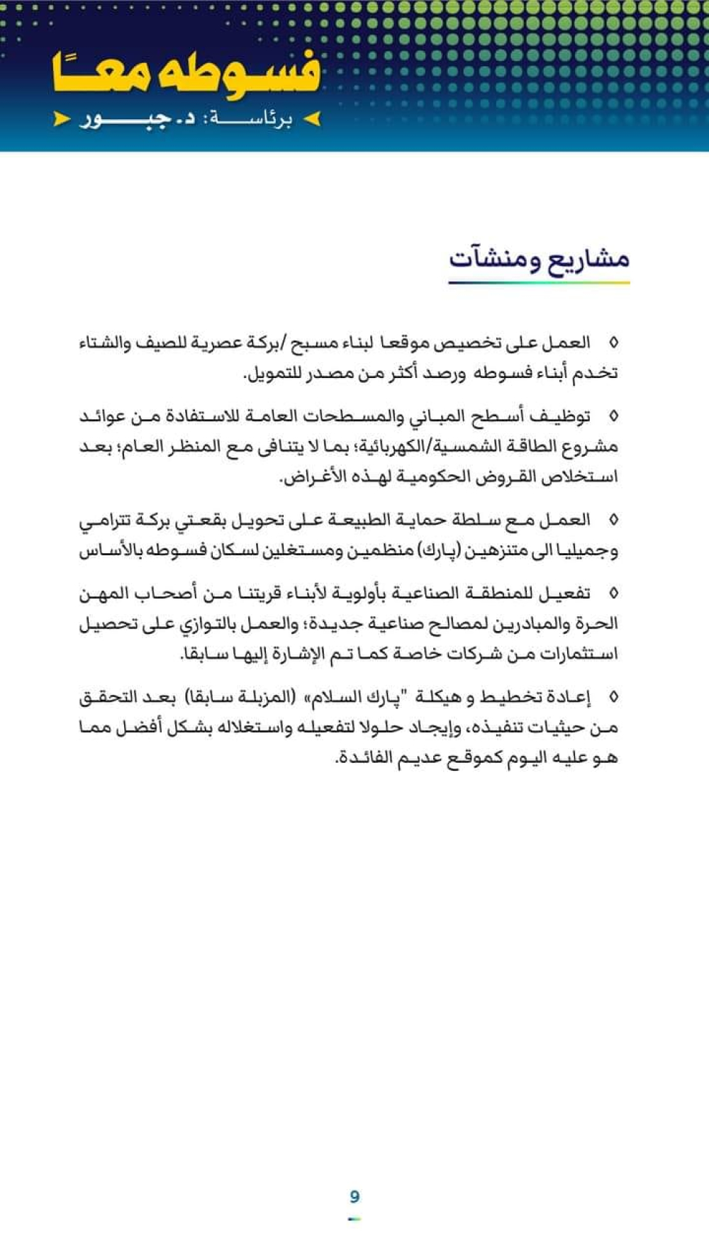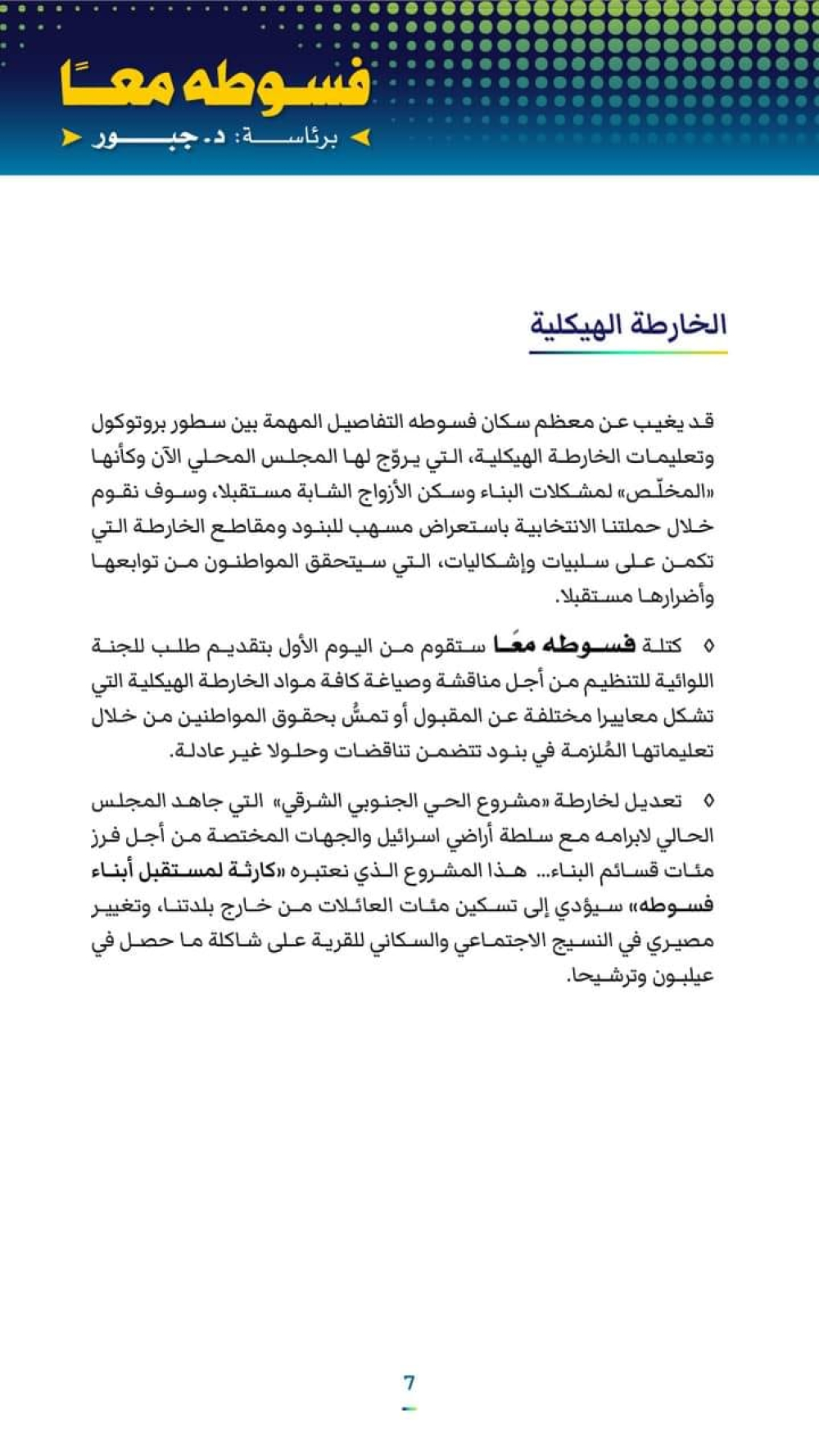 عمم الدكتور جبور بلوط اليوم الأربعاء بياًنا على أبناء بلدته فسوطة نحن شعار "فسوطة معًا", من خلاله برامج عمل مُفصل وواضح في جميع الأطر والمجالات في حال وصوله لمنصب رئاسة مجلس فسوطة.