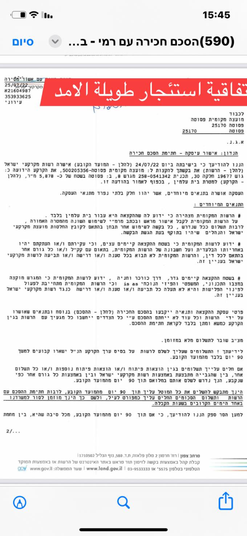 وتم ابرام اتفاقية استئجار طويلة الأمد مع سلطة أراضي إسرائيل بخصوص الأرض المُعدة للبناء.