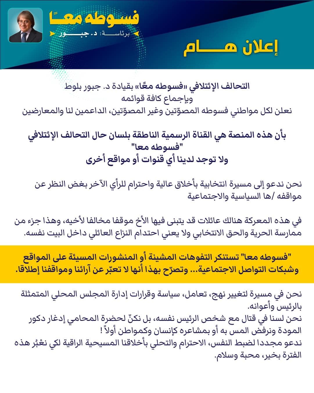 عممت قائمة فسوطة معًا بيانًا على اهالي القرية جاء مفاده: