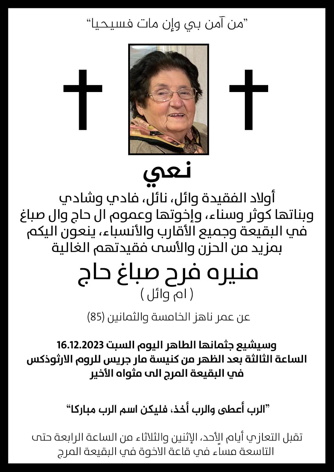 سيشيع جثمان الفقيدة اليوم السبت 16.12.2023 الساعه الثالثة بعد الظهر من كنيسة مار جوارجيوس للروم الارثوذكس في البقيعة المرج ومن ثم الى مثواه الاخير