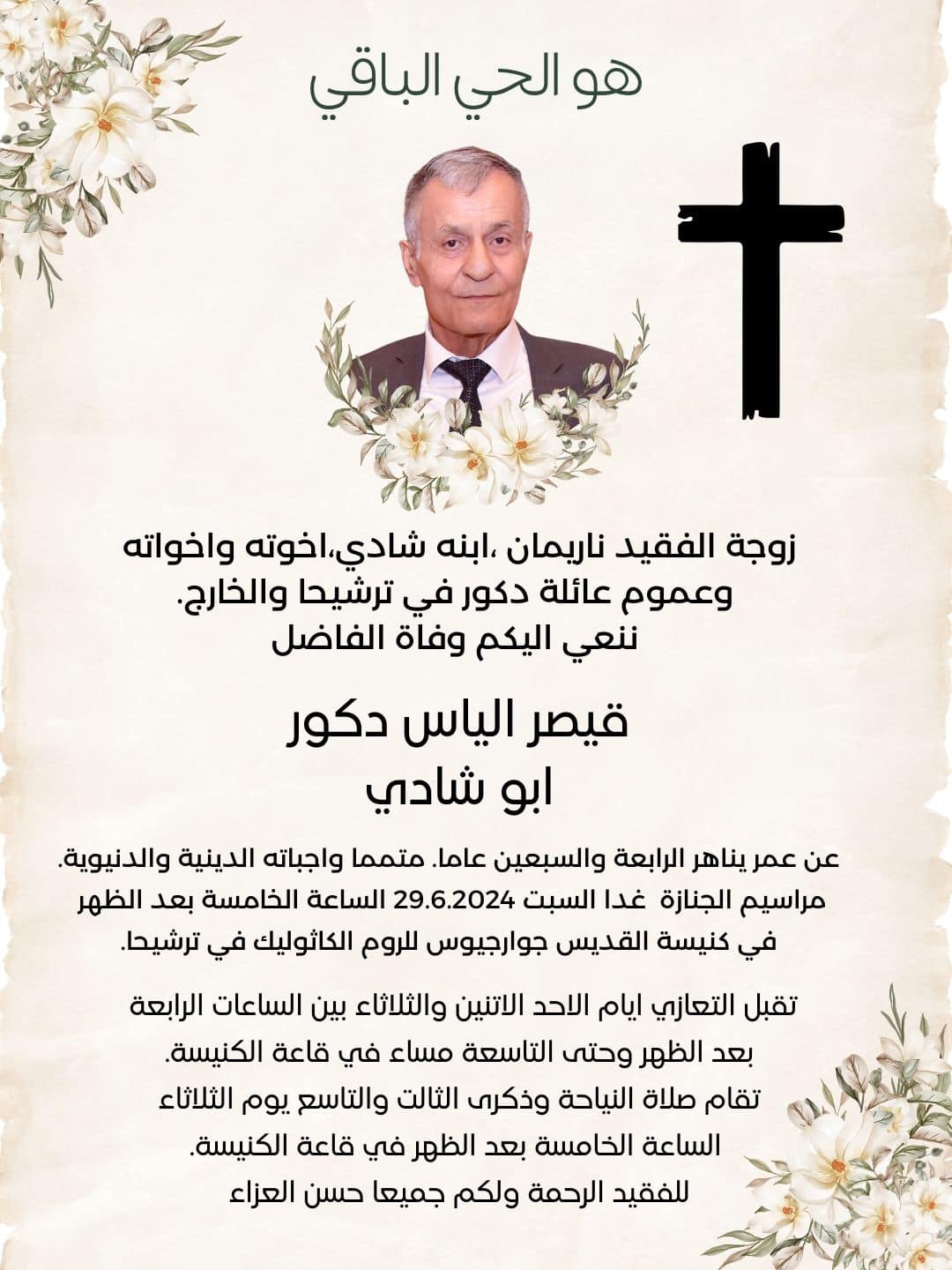 المرحوم قيصر الياس دكور- ابو شادي ينتقل الى الاخدار السماوية عن عمر 74 سنة
