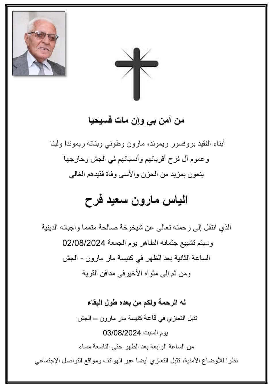 01 أغسطس الجش- المرحوم الياس مارون فرح- ابو ريموند ينتقل الى الاخدار السماوية من طرف : مصادر اخرى 2024-08-01 وفيات الجش- المرحوم الياس مارون فرح- ابو ريموند ينتقل الى الاخدار السماوية