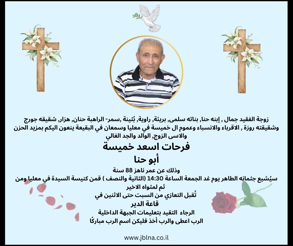 21 نوفمبر معليا- وفاة طيب الذكر- ابو حنا فرحات اسعد خميسة عن عمر ناهز ال 88 سنة من طرف : مصادر اخرى 2024-11-21 وفيات معليا- وفاة طيب الذكر- ابو حنا فرحات اسعد خميسة عن عمر ناهز ال 88 سنة