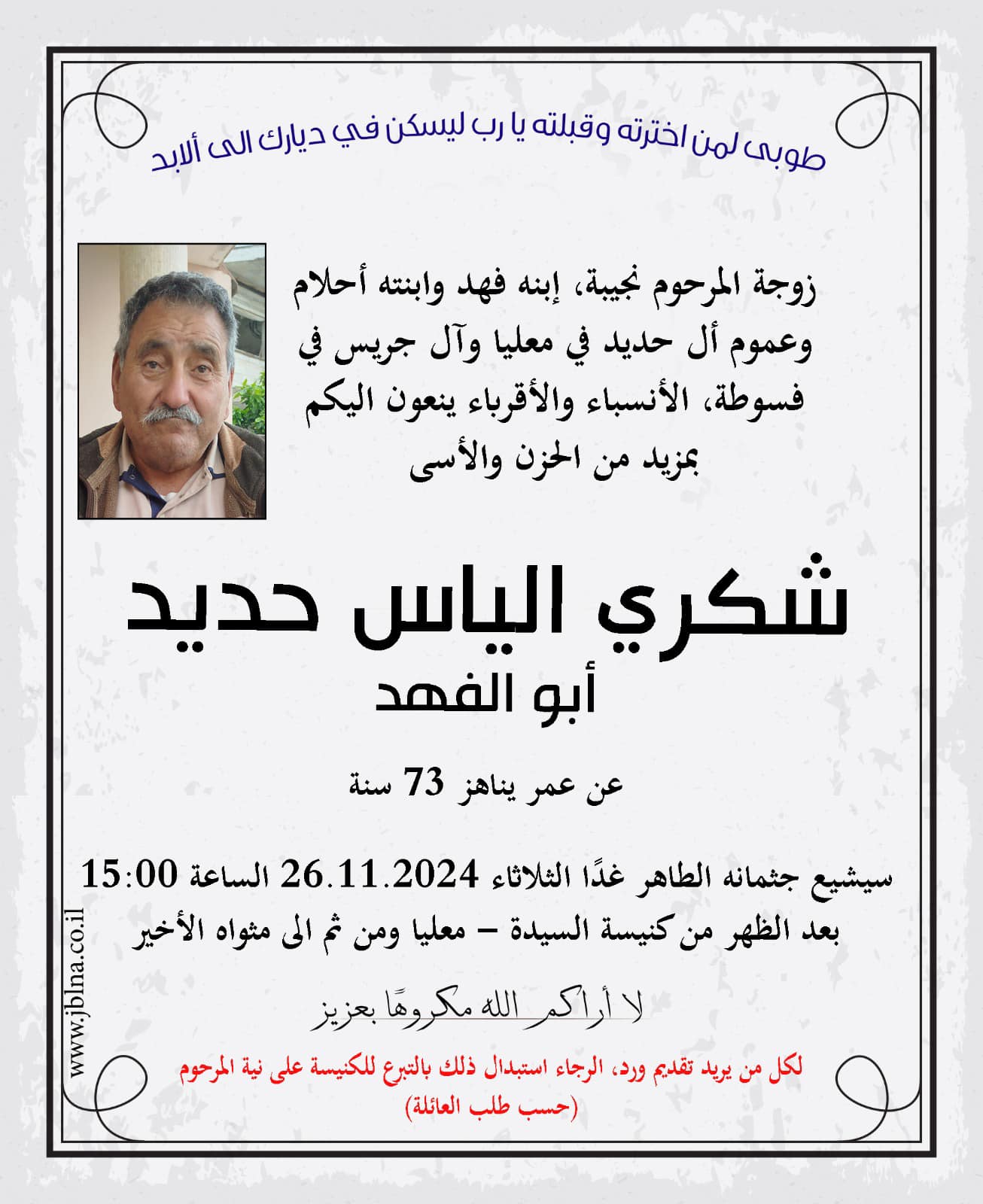 25 نوفمبر معليا- وفاة طيب الذكر شكري الياس حديد- ابو الفهد 73 سنة من طرف : مصادر اخرى 2024-11-25 وفيات معليا- وفاة طيب الذكر شكري الياس حديد- ابو الفهد 73 سنة
