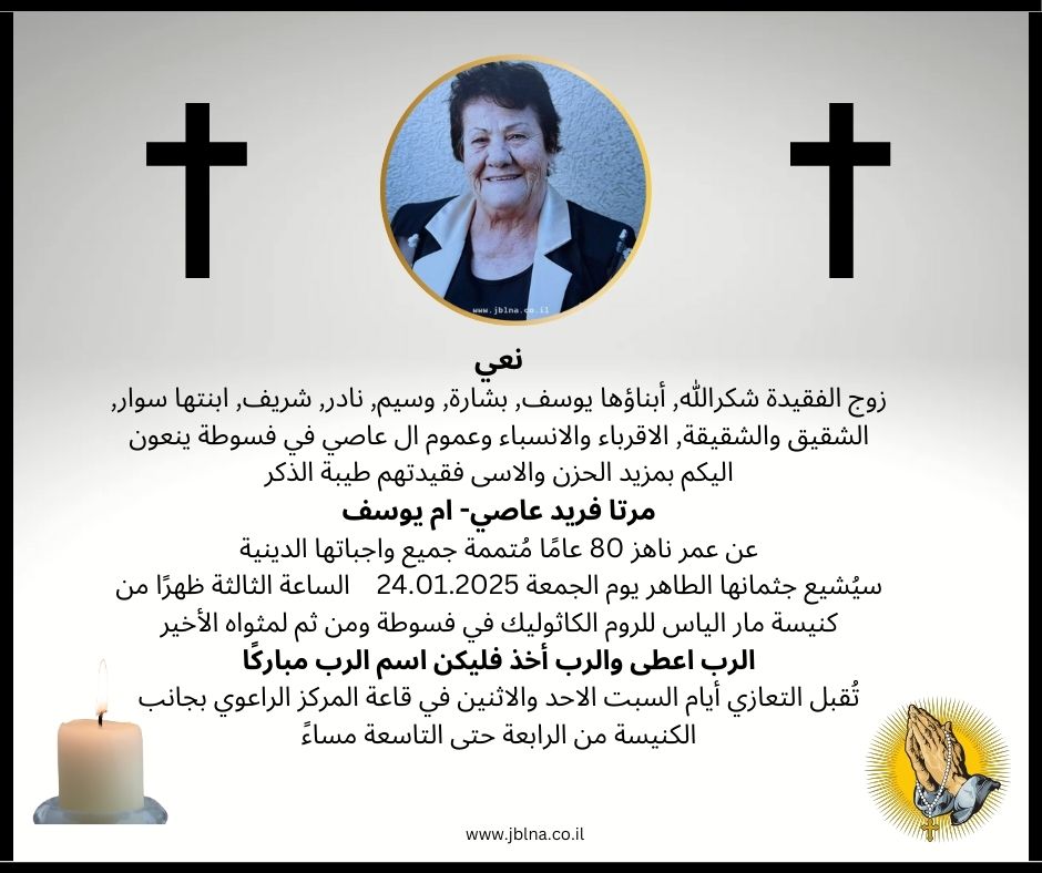 24 يناير فسوطة- وفاة طيبة الذكر مرتا فريد عاصي- ام يوسف 80 عامًا من طرف : مصادر اخرى 2025-01-24 وفيات فسوطة- وفاة طيبة الذكر مرتا فريد عاصي- ام يوسف 80 عامًا