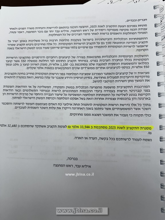 رغم الظروف الأنفة, مُضاعفات الحرب, الأوضاع الاقتصادية العامة, وتقليص هبة الموازنة (מענק איזון) بقيمة 550 الف شيكل, استطاع مجلس معليا المحلي وفي ظرف جلستين فقط تمرير ميزانية 2025 بأجواء مهنية وإيجابية مثالية تُلائم الأجواء العامة في البلدة...