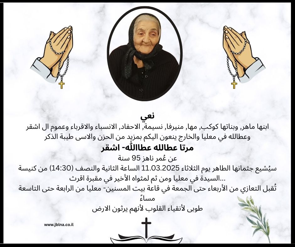 10 مارس معليا- اقرث - وفاة طيبة الذكر مرتا عطالله عطالله اشقر- ام ماهر -95 سنة من طرف : مصادر اخرى 2025-03-10 وفيات معليا- اقرث - وفاة طيبة الذكر مرتا عطالله عطالله اشقر- ام ماهر -95 سنة