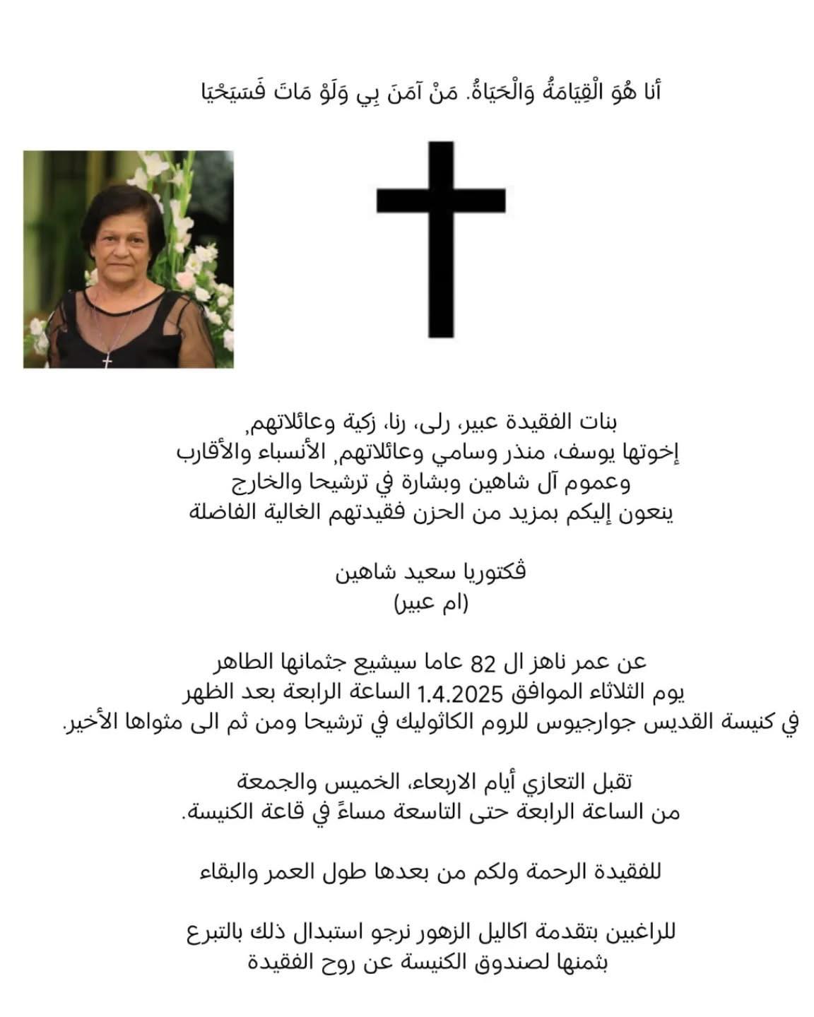 01 أبريل ترشيح-ا وفاة الفاضلة فكتوريا سعيد شاهين- ام عبير -82 سنة من طرف : مصادر اخرى 2025-04-01 وفيات ترشيح-ا وفاة الفاضلة فكتوريا سعيد شاهين- ام عبير -82 سنة