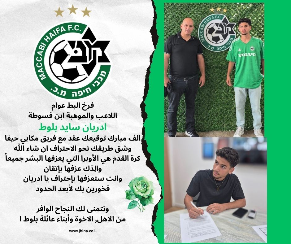 ادريان ابن صف التاسع في مدرسة الحوار فسوطة ابرم صباح اليوم عقدًا مع فريق مكابي حيفا (شبيبة ب) נערים ב الذي كان بتواصل دائم مع مدربي باوك معليا اندري فران ومبدا عيد....