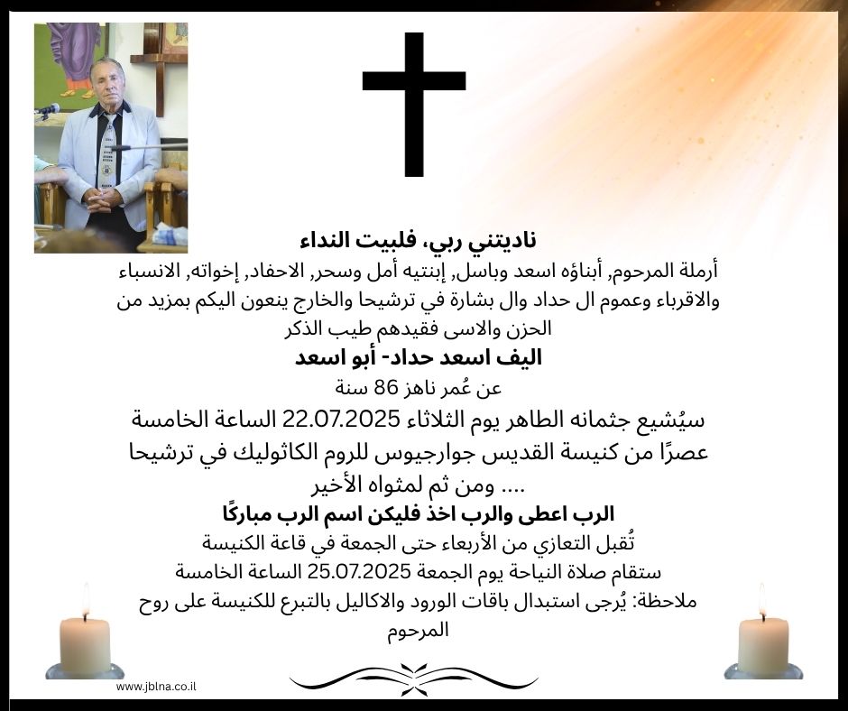 21 يوليو ترشيحا- وفاة طيب الذكر اليف-اسعد حداد- ابو اسعد-86 سنة من طرف : مصادر اخرى 2025-07-21 وفيات ترشيحا- وفاة طيب الذكر اليف-اسعد حداد- ابو اسعد