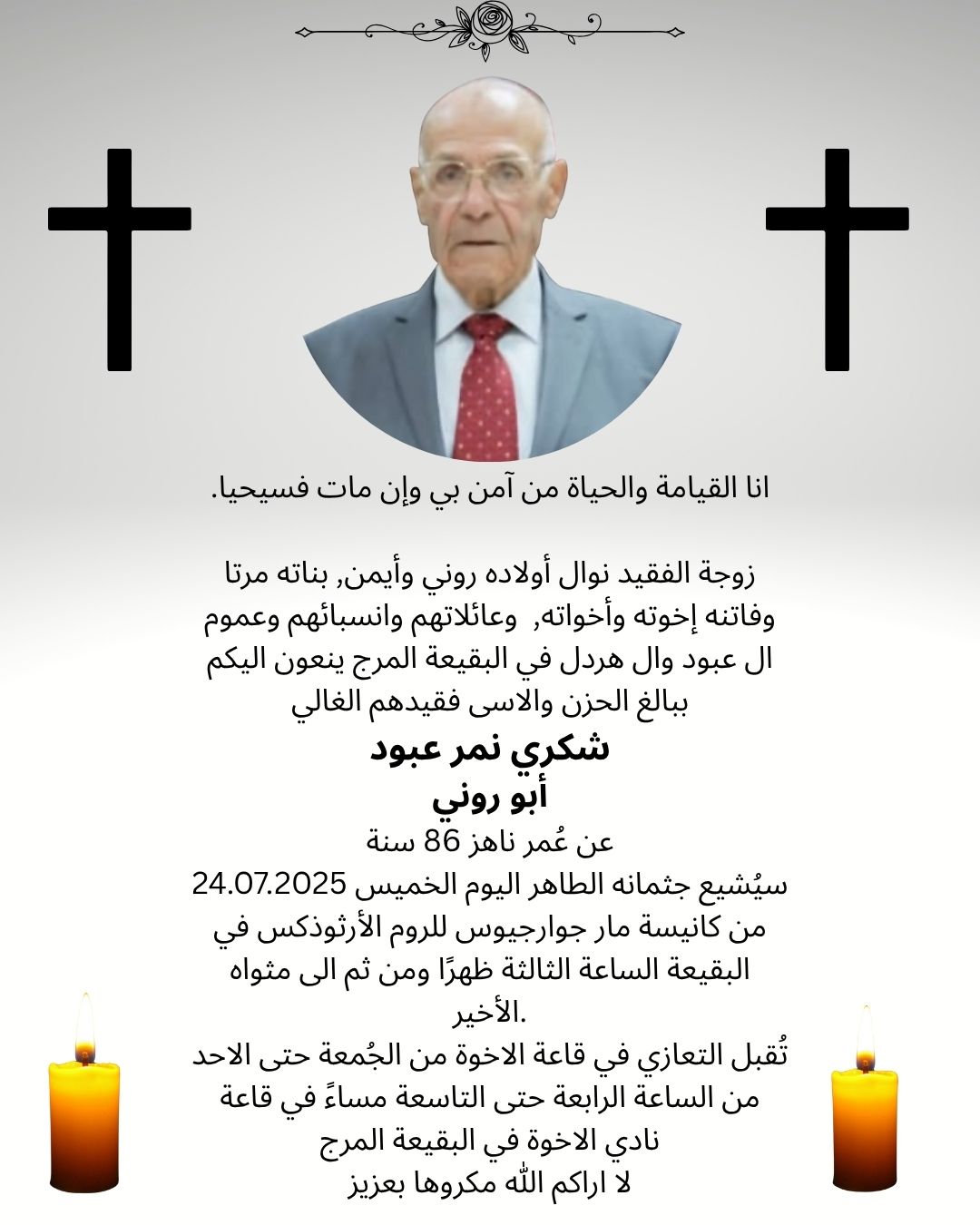 24 يوليو البقيعة المرج- وفاة طيب الذكر شكري نمر عبود- ابو روني عن عمر ناهز 86 سنة من طرف : مصادر اخرى 2025-07-24 وفيات البقيعة المرج- وفاة طيب الذكر شكري نمر عبود- ابو روني عن عمر ناهز 86 سنة