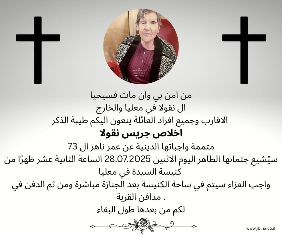 28 يوليو معليا- وفاة طيبة الذكر اهلاص جريس نقولا 73 سنة من طرف : مصادر اخرى 2025-07-28 وفيات معليا- وفاة طيبة الذكر اهلاص جريس نقولا 73 سنة