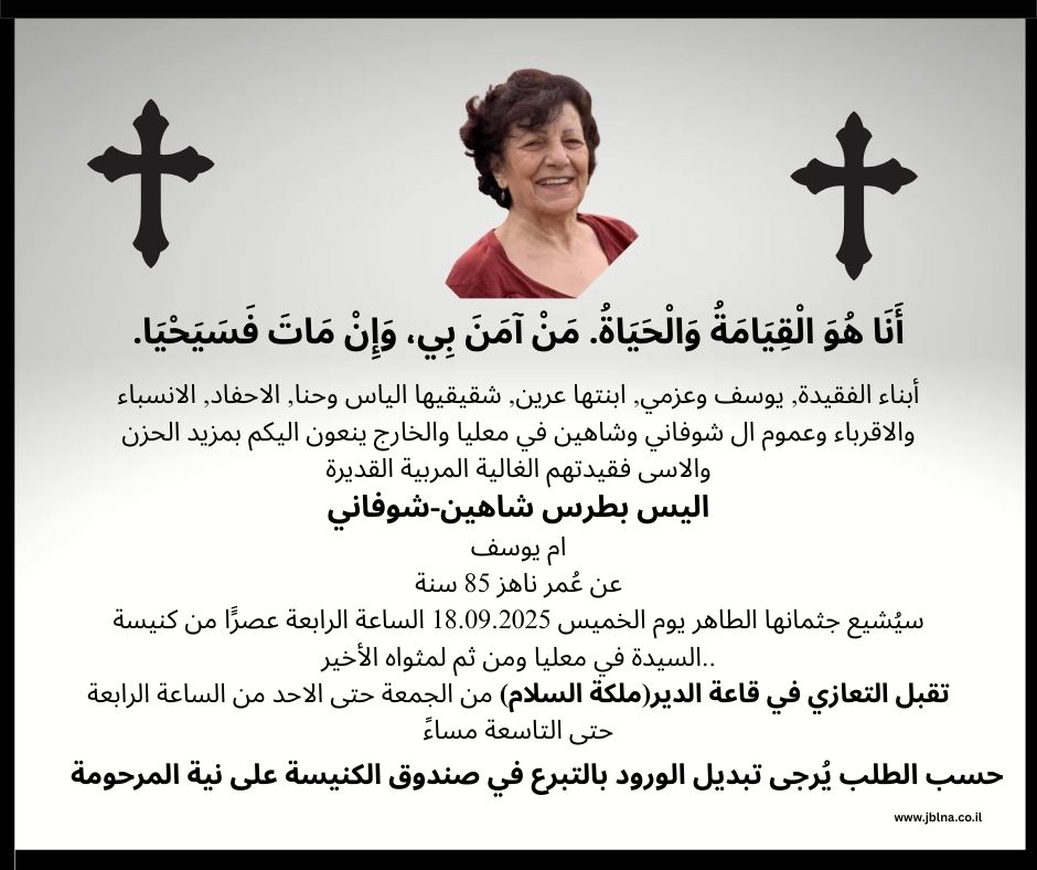 17 سبتمبر معليا- وفاة طيبة الذكر المربية القديرة اليس بطر شاهين شوفاني- ام يوسف عن 85 سنة من طرف : مصادر اخرى 2025-09-17 وفيات معليا- وفاة طيبة الذكر المربية القديرة اليس بطر شاهين شوفاني- ام يوسف عن 85 سنة