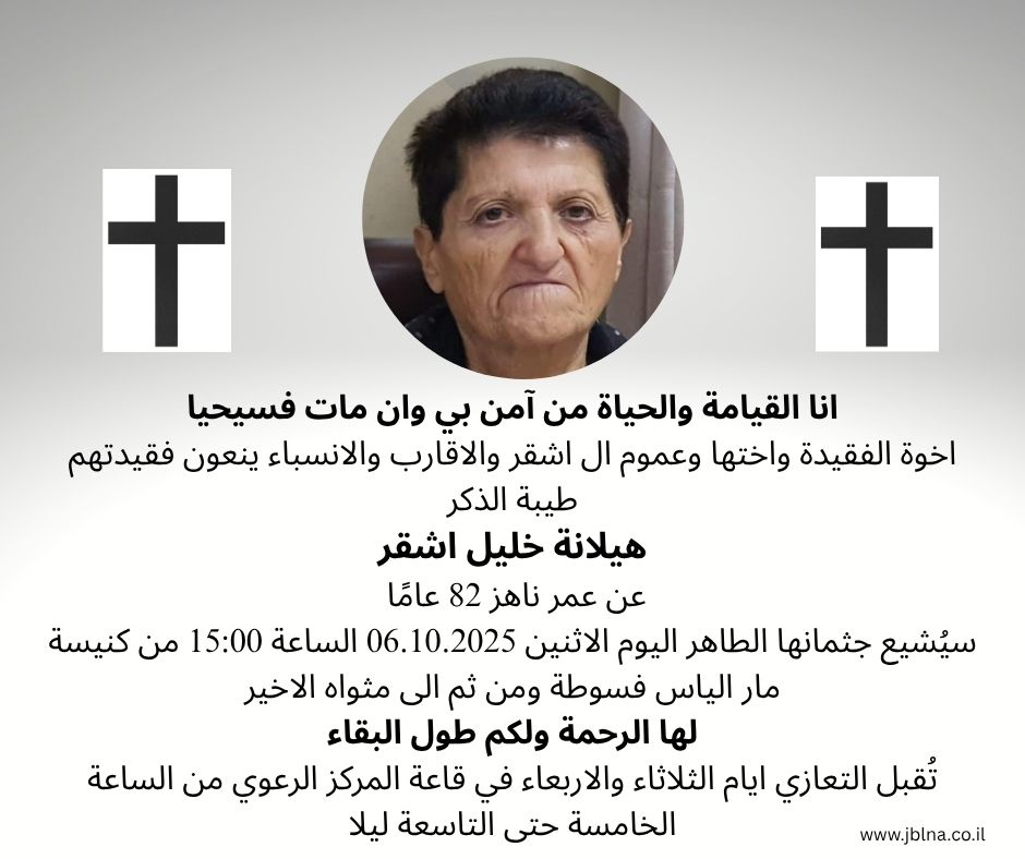 06 أكتوبر فسوطة- وفاة طيبة الذكر هيلانة خليل اشقر عن عمر ناهز 82 عامًا من طرف : مصادر اخرى 2025-10-06 وفيات فسوطة- وفاة طيبة الذكر هيلانة خليل اشقر عن عمر ناهز 82 عامًا