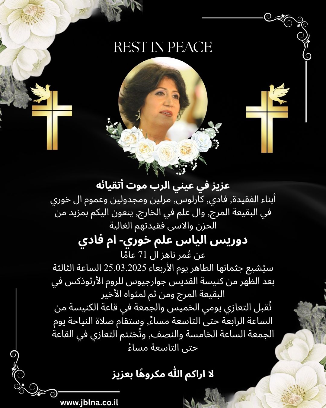 24 مارس البقيعة-المرج- وفاة الاديبة والكاتبة دوريس خوري- ام فادي من طرف : مصادر اخرى 2026-03-24 وفيات البقيعة-المرج- وفاة الاديبة والكاتبة دوريس خوري- ام فادي