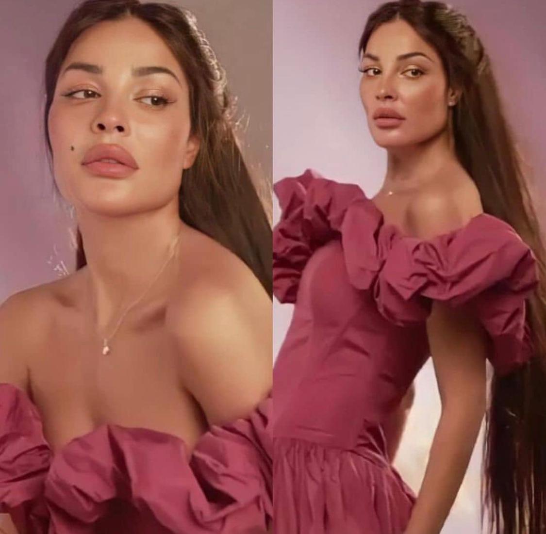 وقد خطفت الأنظار بإطلالتها حيث ارتدت فستاناً من دون أكتاف وردي اللون، وظهرت بشعر طويل جداً وبماكياج ناعم.