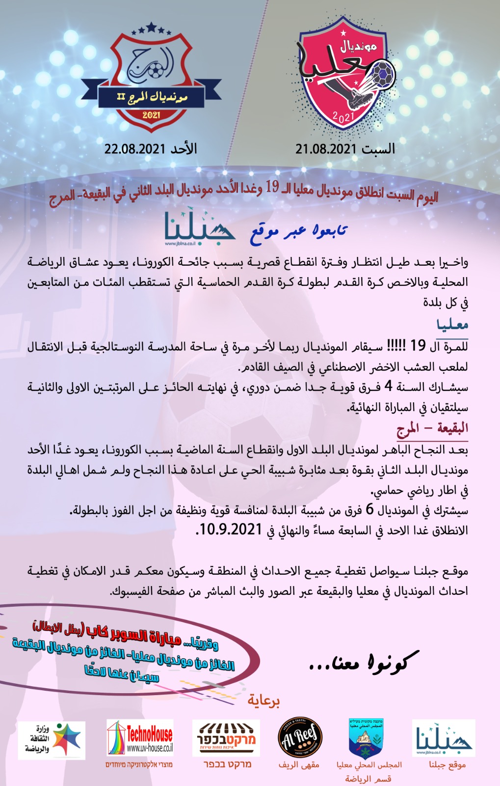 موقع جبلنا سيواصل تغطية جميع الاحداث في المنطقة وسيكون معكم قدر الامكان في تغطية احداث المونديال في معليا والبقيعة عبر الصور والبث المباشر من صفحة الفيسبوك