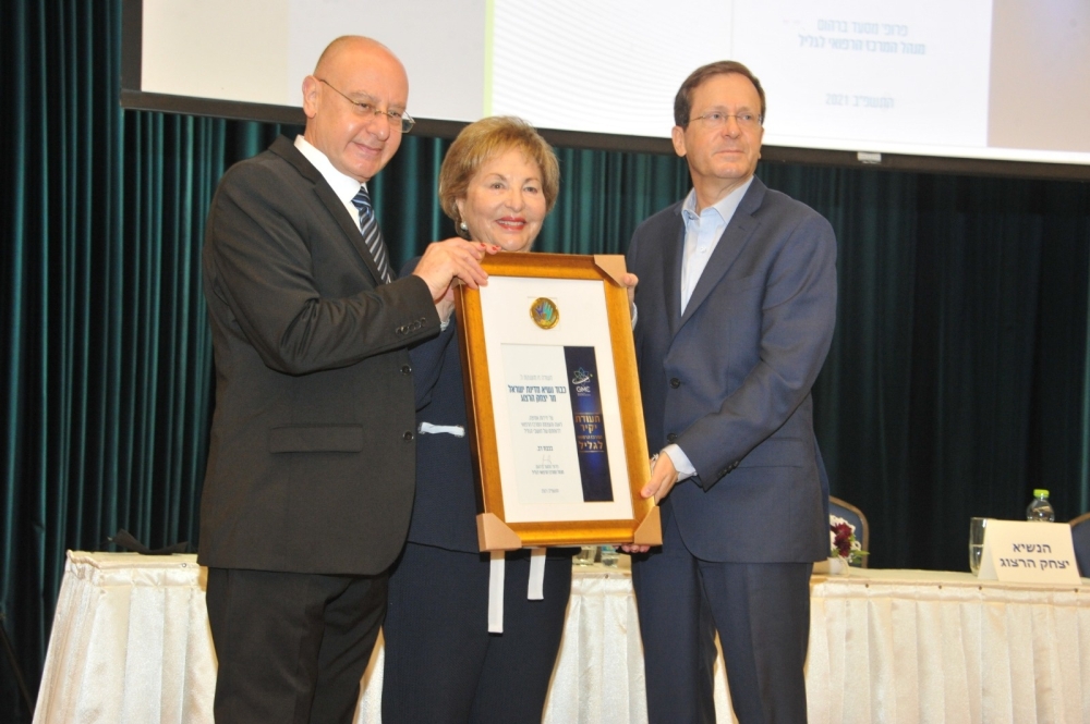 وفي نهاية اللقاء تم تقديم شهادة تقدير لفخامة رئيس الدولة من قبل مدير المركز البروفيسور برهوم ورئيسة جمعية أصدقاء المركز رعيا شتراوس بن درور