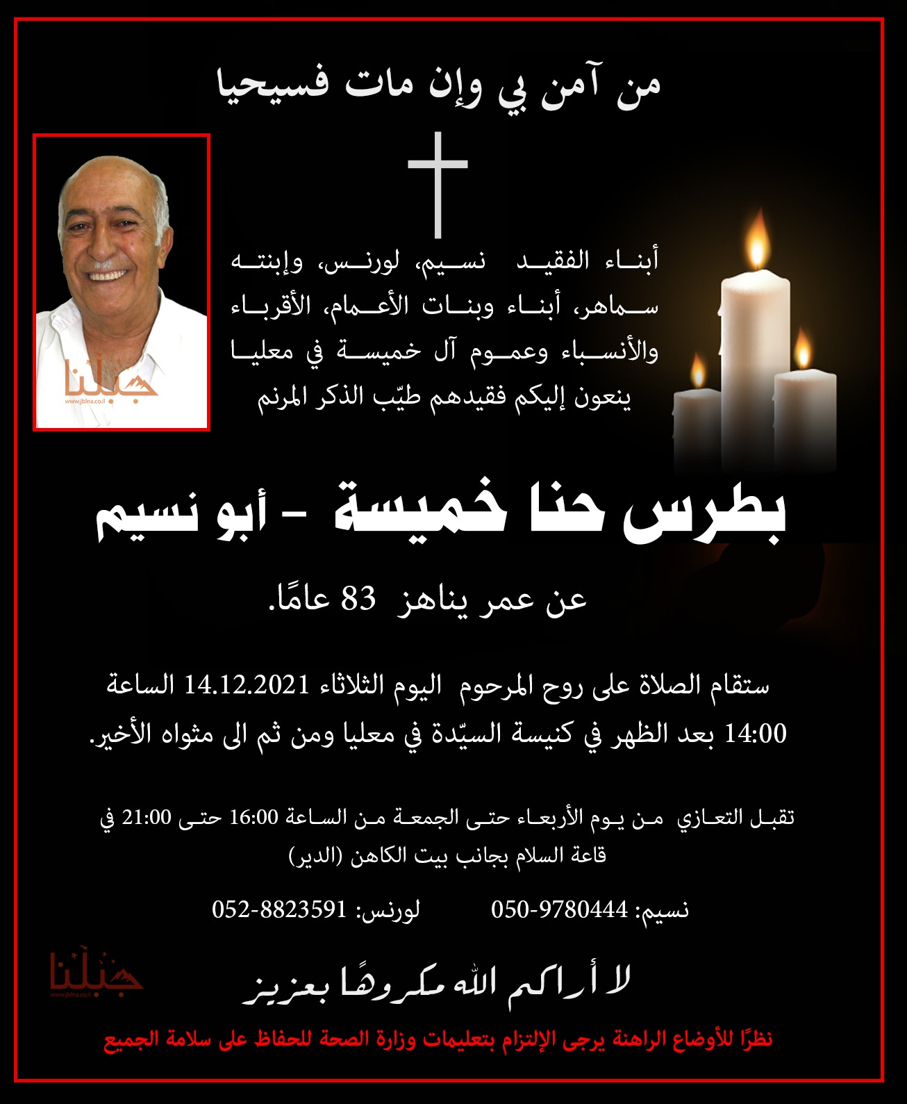 معليا- وفاة مرنم الكنيسة بطرس حنا خميسة- ابو نسيم, عن عمر 83 سنة