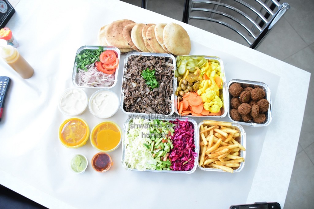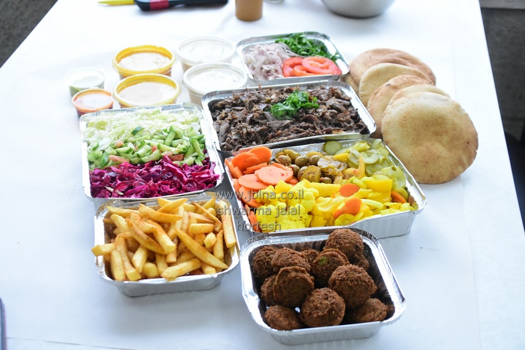 מגש شوارما عائلي+מגש فلافل+מגש سلطات+מגש بطاطا وحمص محلي اضافة 10 كماجات فقط 150 שקלاهلا وسهلا