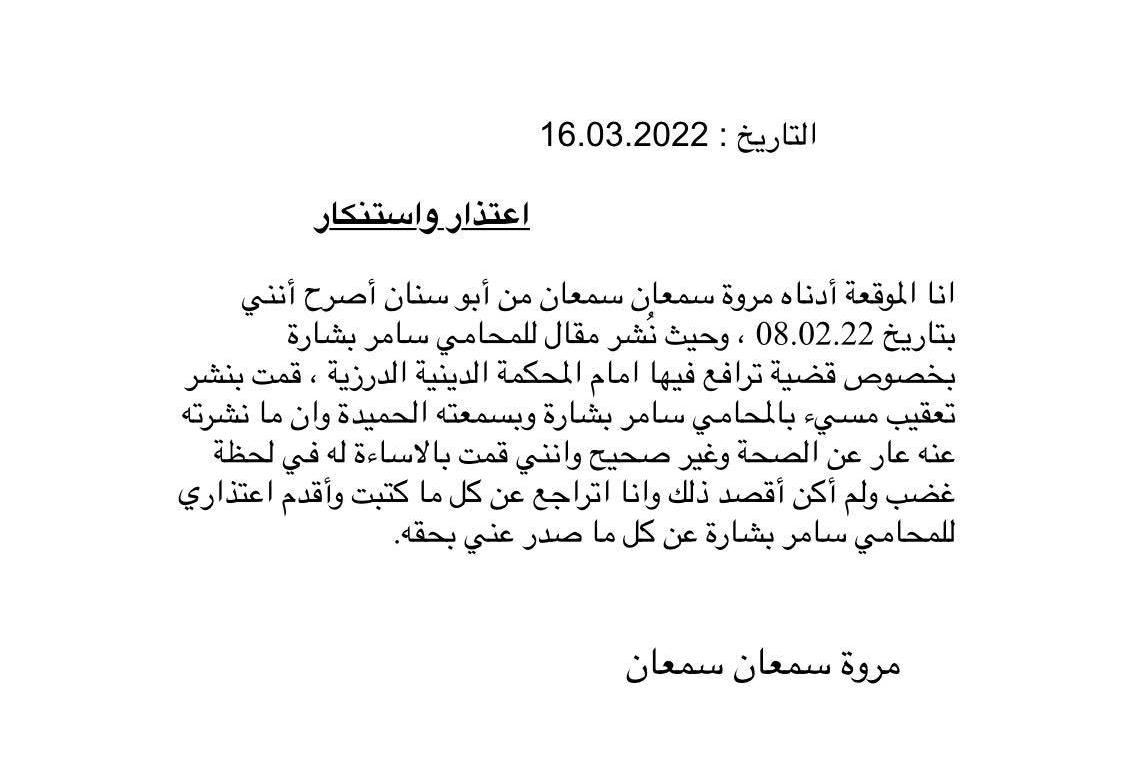 20 مارس اعتذار واستنكار من الاخت مروة سمعان للمحامي سامر بشارة من طرف : مصادر اخرى 2022-03-20 محليات اعتذار واستنكار من الاخت مروة سمعان للمحامي سامر بشارة