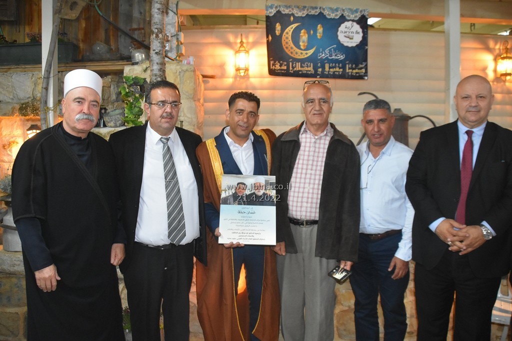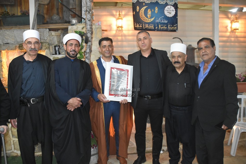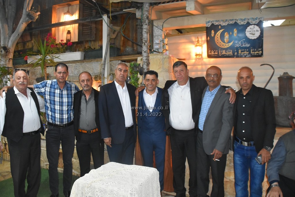 وبعد كلمات التهنئة والترحيب تم تلبيس الاخ غسان عباءة المحبة, والسلام, وتفضل الحضور للأفطار الرمضاني في باحة الاخ وافي عجمية المحترم.