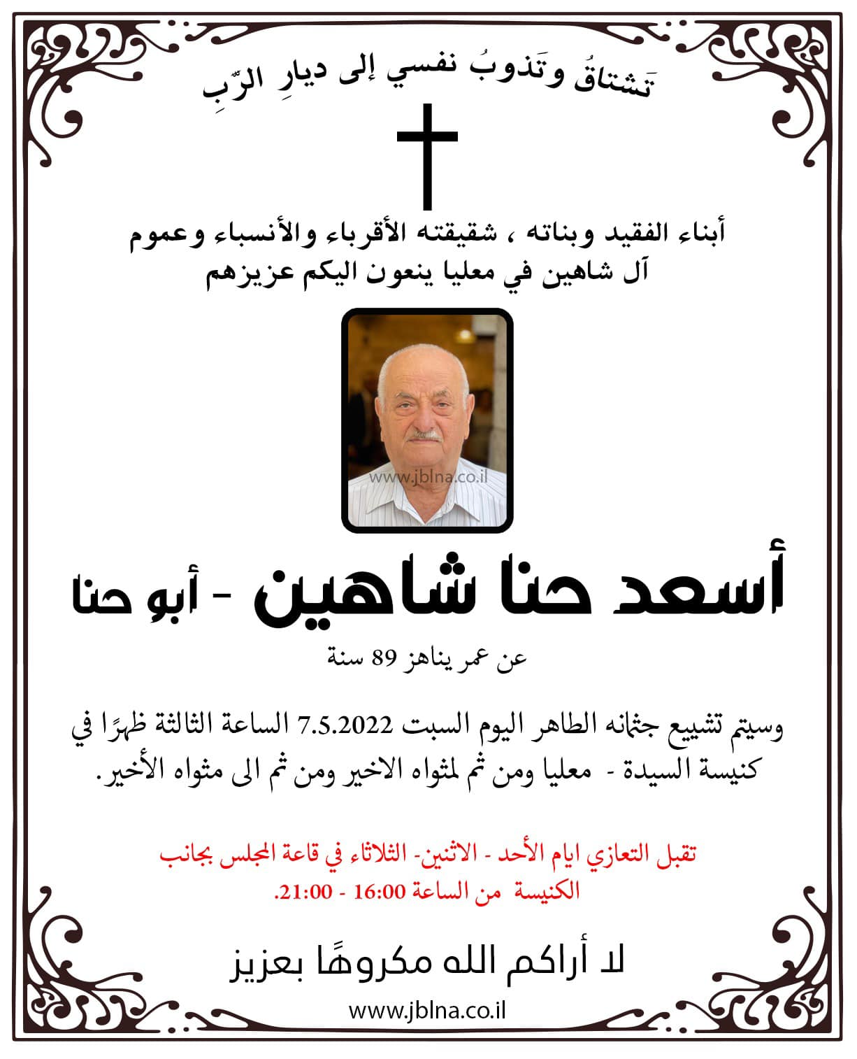 معليا- وفاة الفاضل حنا اسعد شاهين- ابو حنا عن عمر يناهز 89 سنة