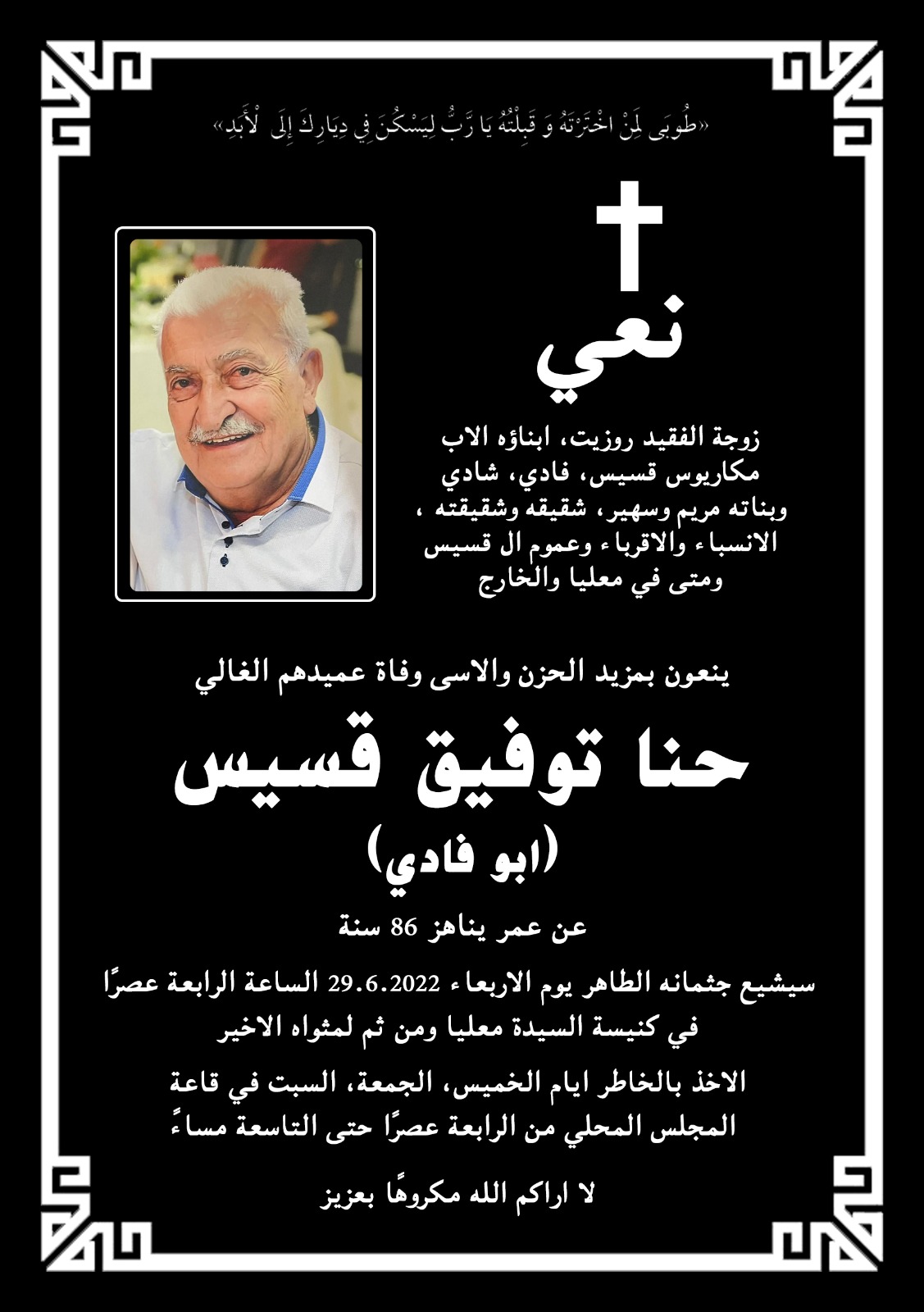 28 يونيو معليا- وفاة الفاضل حنا توفيق قسيس- ابو فادي- 86 سنة من طرف : مصادر اخرى 2022-06-28 وفيات معليا- وفاة الفاضل حنا توفيق قسيس- ابو فادي- 86 سنة