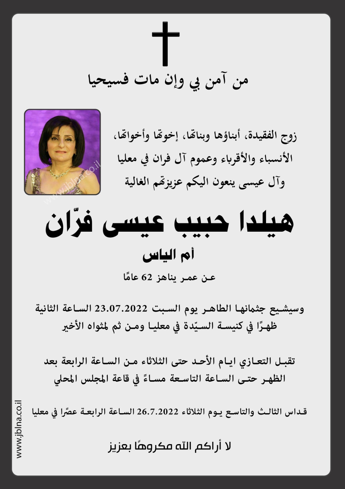 22 يوليو معليا- وفاة الفاضلة هيلدا حبيب عيسى فران- ام الياس- 62 سنة من طرف : مصادر اخرى 2022-07-22 وفيات