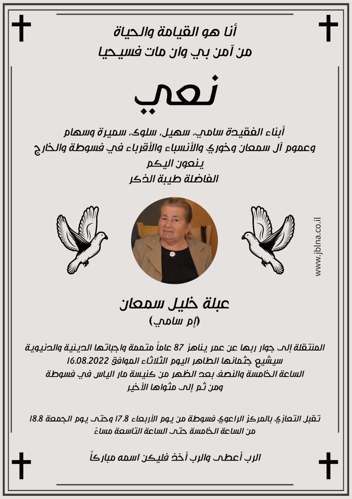 16 أغسطس فسوطة- وفاة الفاضلة عبلة خليل سنعان- ام سامي عن عمر 87 سنة من طرف : مصادر اخرى 2022-08-16 وفيات فسوطة- وفاة الفاضلة عبلة خليل سنعان- ام سامي عن عمر 87 سنة
