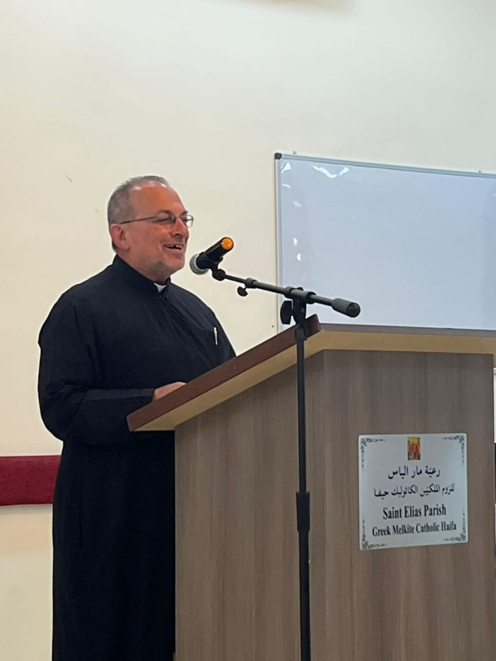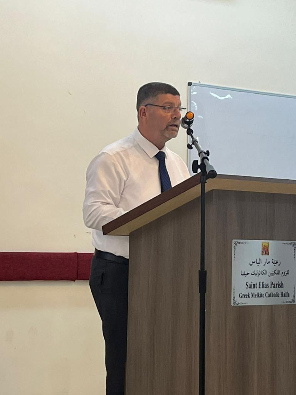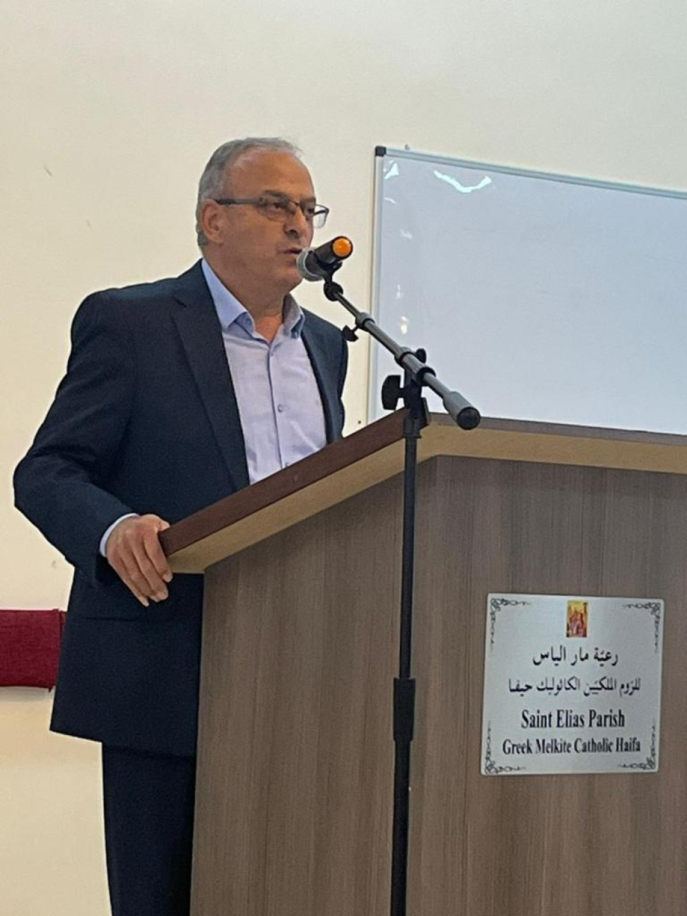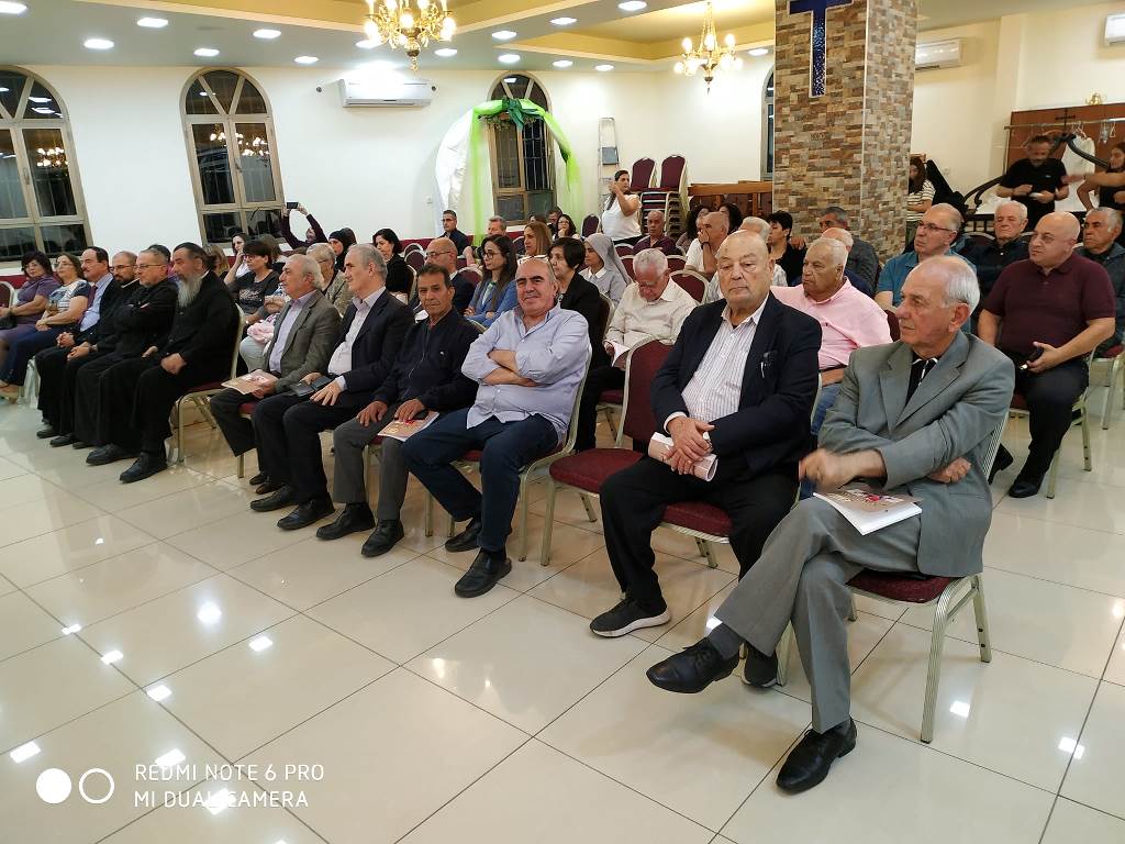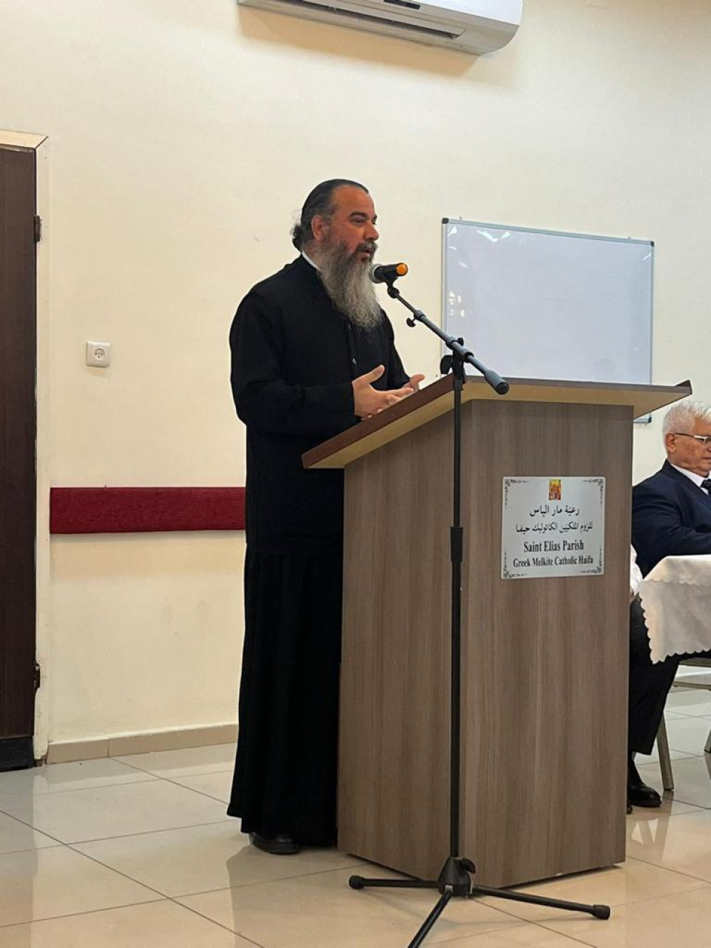 افتتح الأمسية وأدارها الشاعر كميل شقور، وقدم الأرشمندريت أغابيوس أبو سعدى، الرئيس الروحي لرعية مار إلياس في حيفا كلمة ترحيبية هنأ فيها الكاتب وعبّر عن اعتزازه باصداره الأخير. وقال: "نحن نعرف مدى انتماء الكاتب إلى كنيسته وبلده وعائلته، فهو يستحق هذا التكريم."