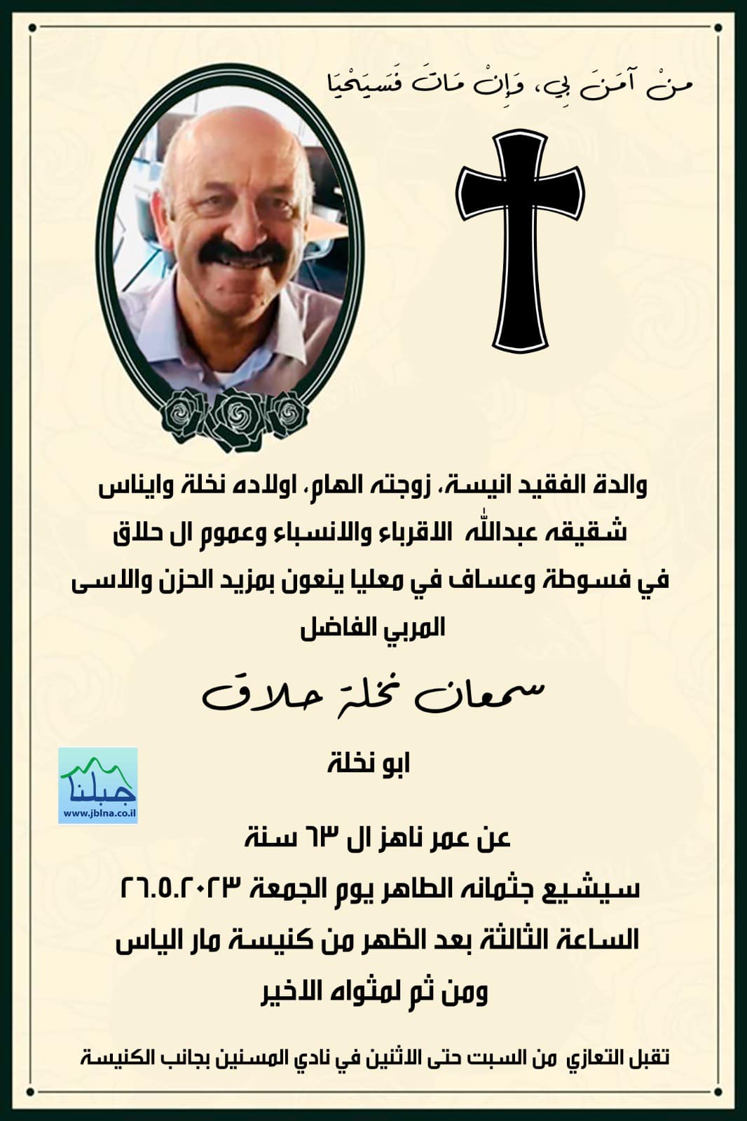 25 مايو فسوطة تفجع بوفاة المربي الفاضل سمعان نخلة حلاق- ابو نخلة عن عمر ناهز 63 سنة من طرف : مصادر اخرى 2023-05-25 وفيات فسوطة تفجع بوفاة المربي الفاضل سمعان نخلة حلاق- ابو نخلة عن عمر ناهز 63 سنة