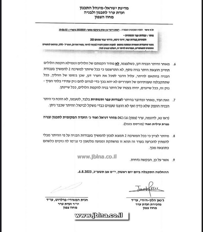 وحيث أنه أُرفق للاستئناف طلب لإيقاف مؤقت لبناء البنى التحتية لحين البث في الاستئناف، أصدرت اليوم الاحد -6.8.2023- لجنة الاستئناف قراراً بشأن الطلب المؤقت بموجبه:
