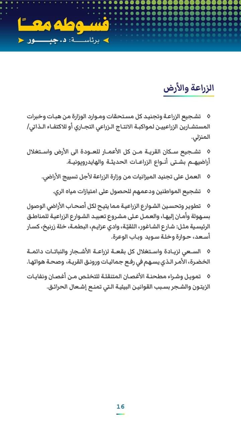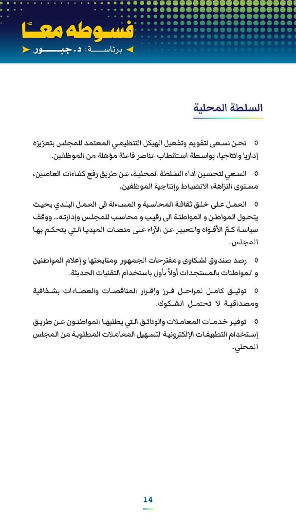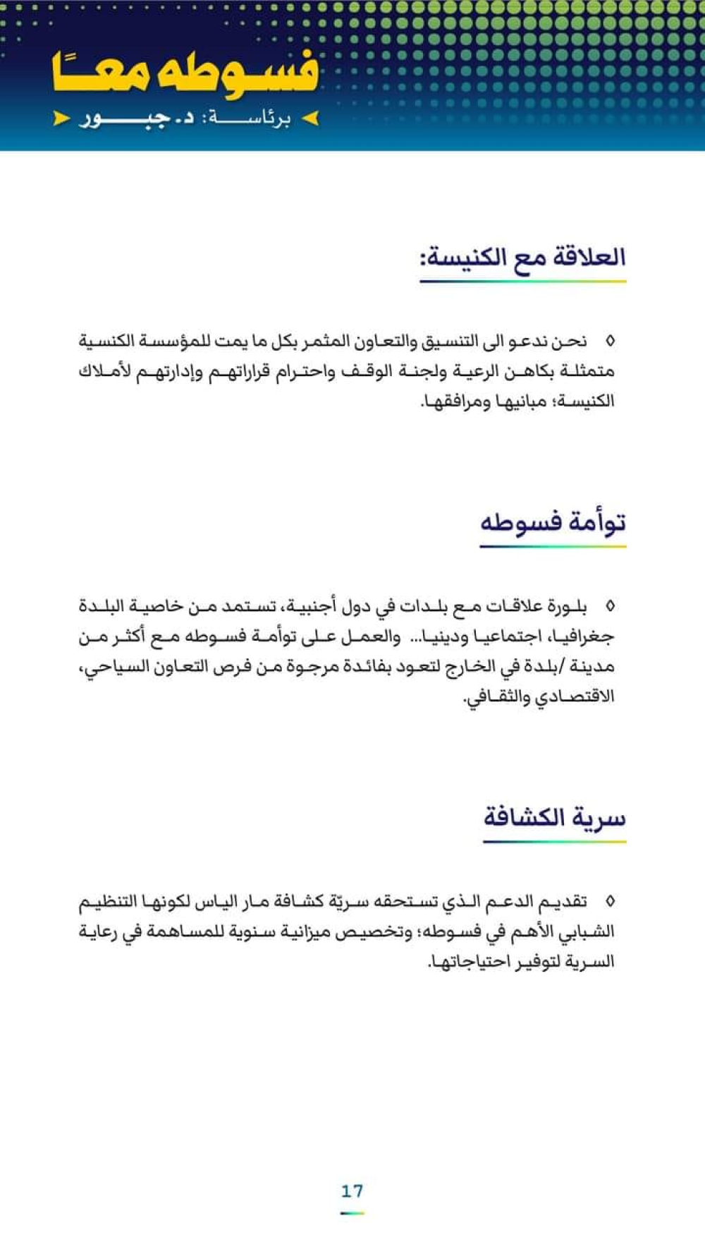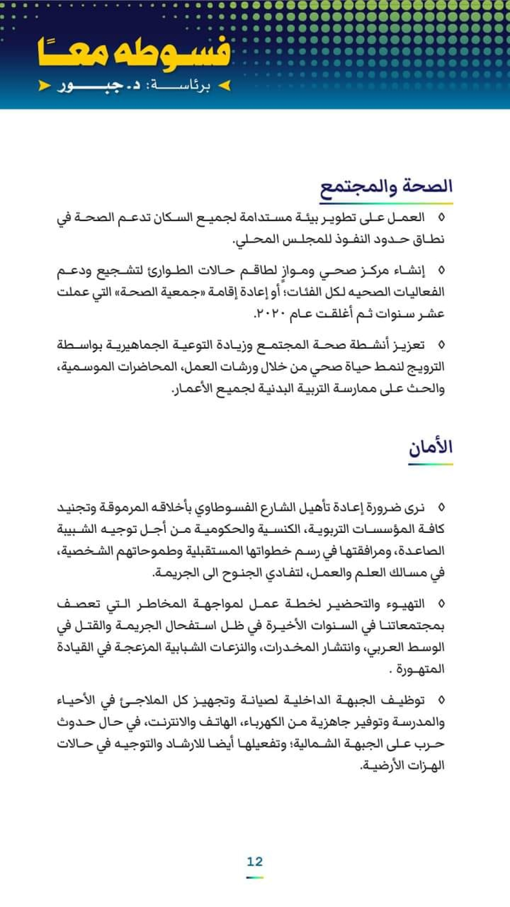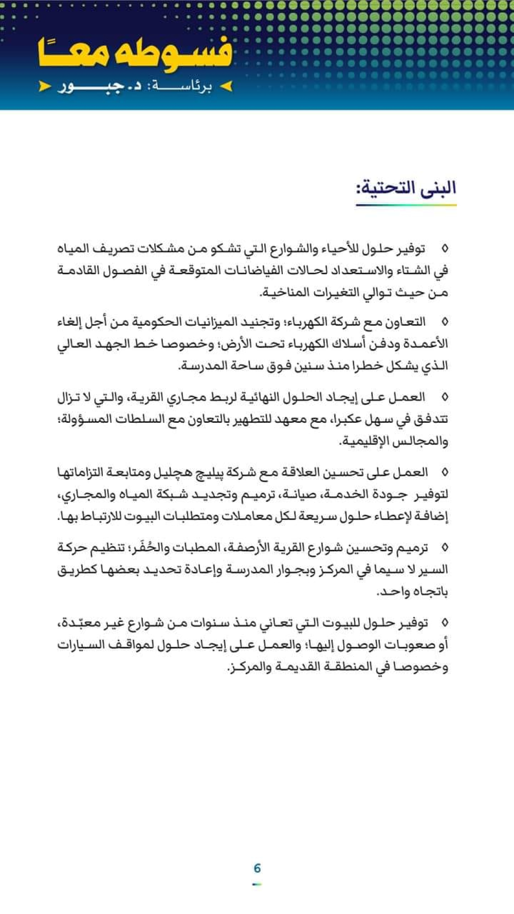 عمم الدكتور جبور بلوط اليوم الأربعاء بياًنا على أبناء بلدته فسوطة نحن شعار "فسوطة معًا", من خلاله برامج عمل مُفصل وواضح في جميع الأطر والمجالات في حال وصوله لمنصب رئاسة مجلس فسوطة.