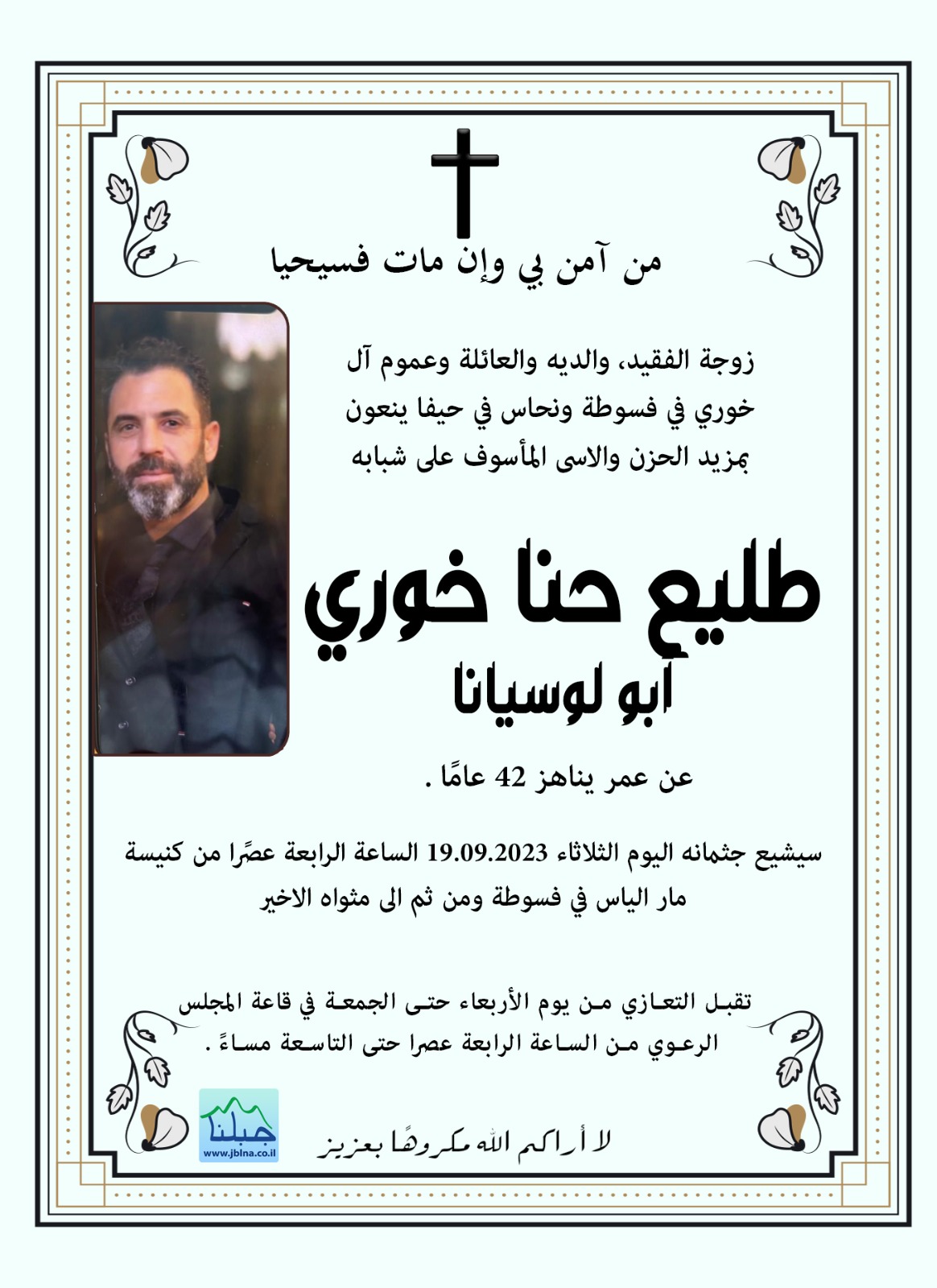 19 سبتمبر فسوطة- وفاة المأسوف على شبابه طليع حنا خوري- 42 سنة من طرف : مصادر اخرى 2023-09-19 وفيات فسوطة- وفاة المأسوف على شبابه طليع حنا خوري- 42 سنة