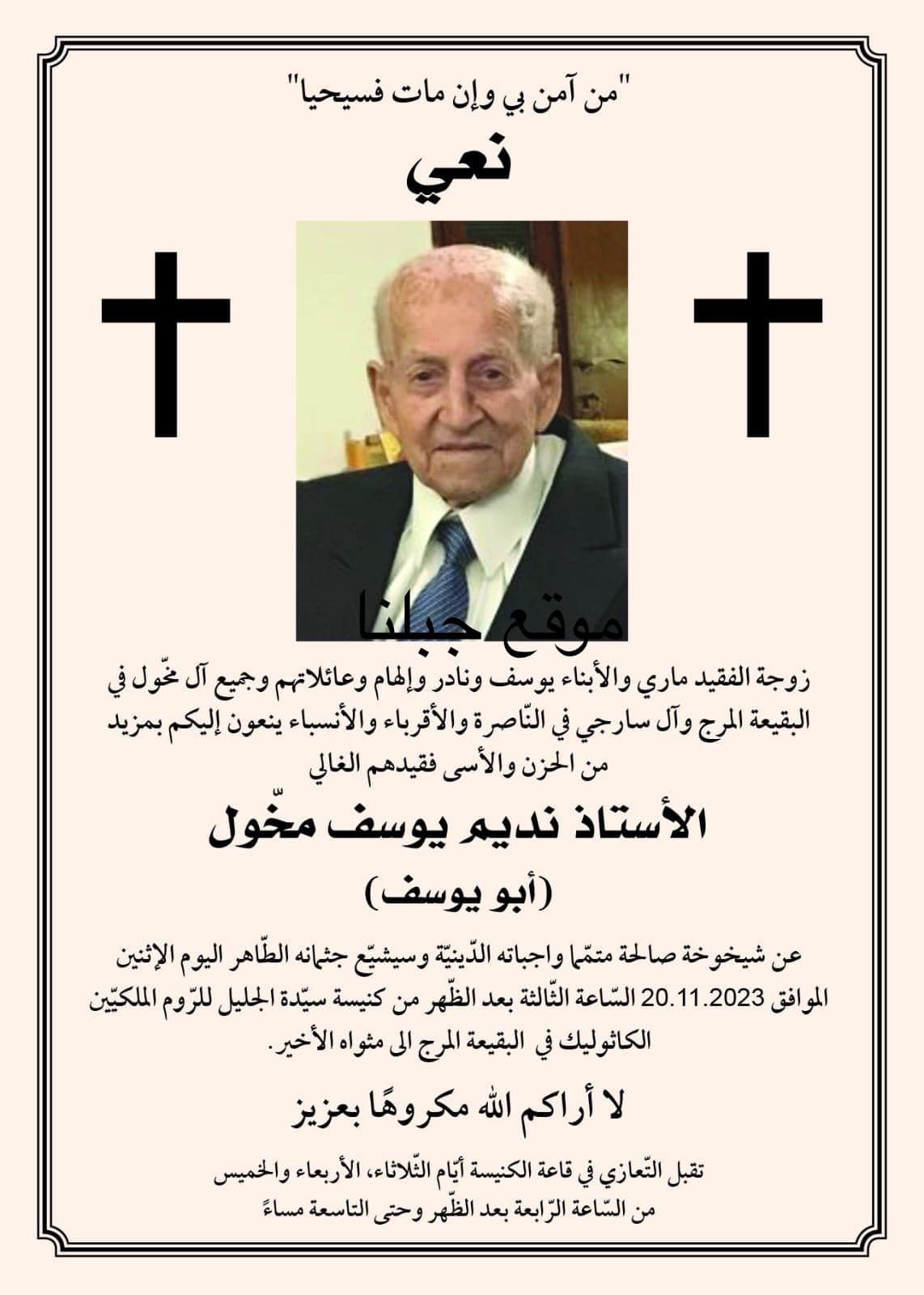 20 نوفمبر البقيعة- وفاة المربي الفاضل نديم يوسف مخول- ابو يوسف من طرف : مصادر اخرى 2023-11-20 وفيات البقيعة- وفاة المربي الفاضل نديم يوسف مخول- ابو يوسف