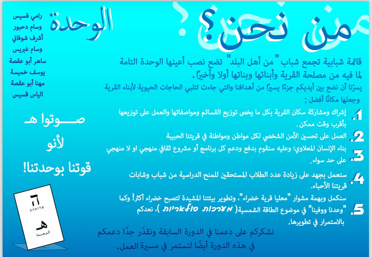 قائمة الوحدة للعضوية في معليا بطاقة هوية الوحدة بوحدة شبابنا وبناتنا شعار القائمة: (هـ)