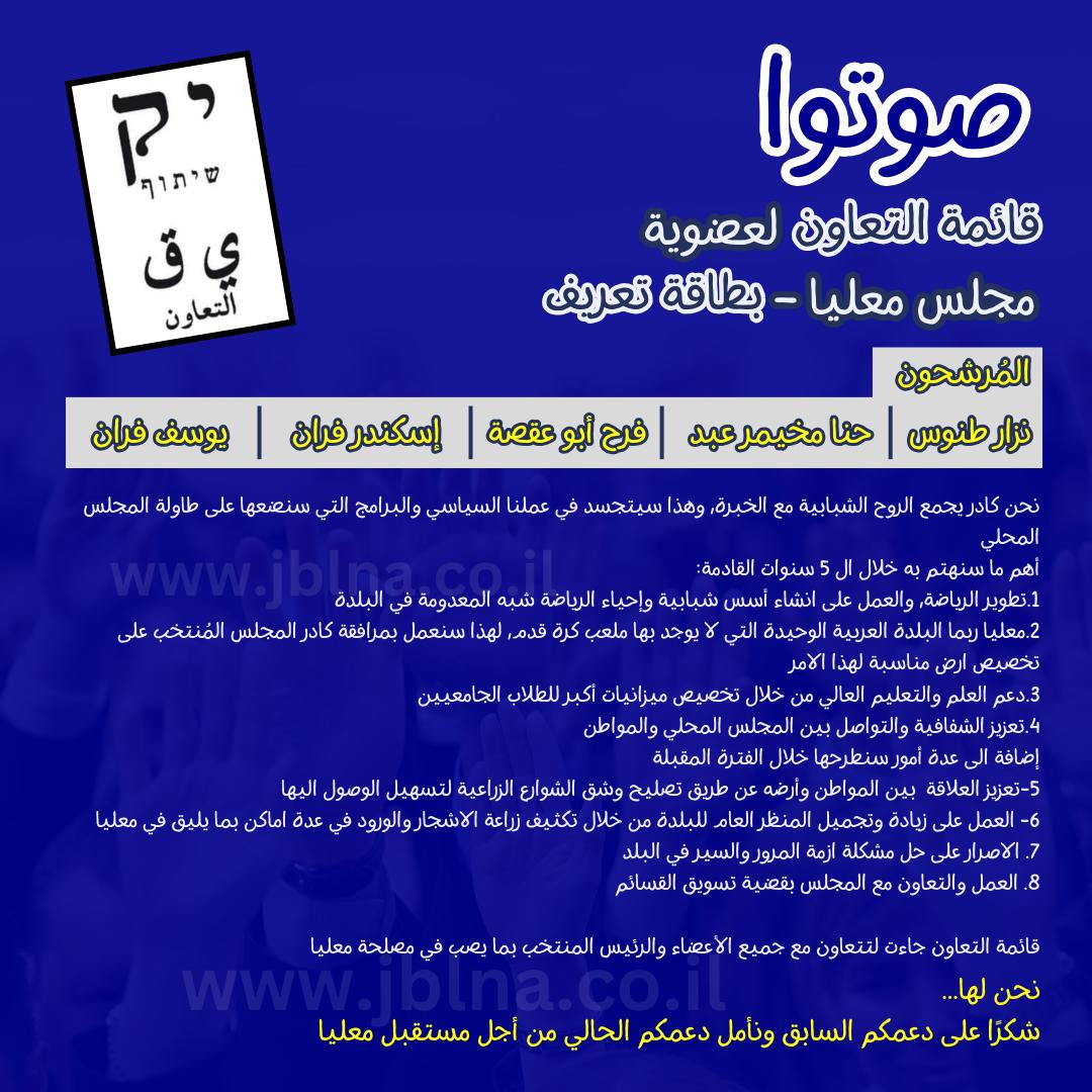 انتخابات السلطات المحلية- معليا - قائمة التعاون وشعارها ي ق (יק)