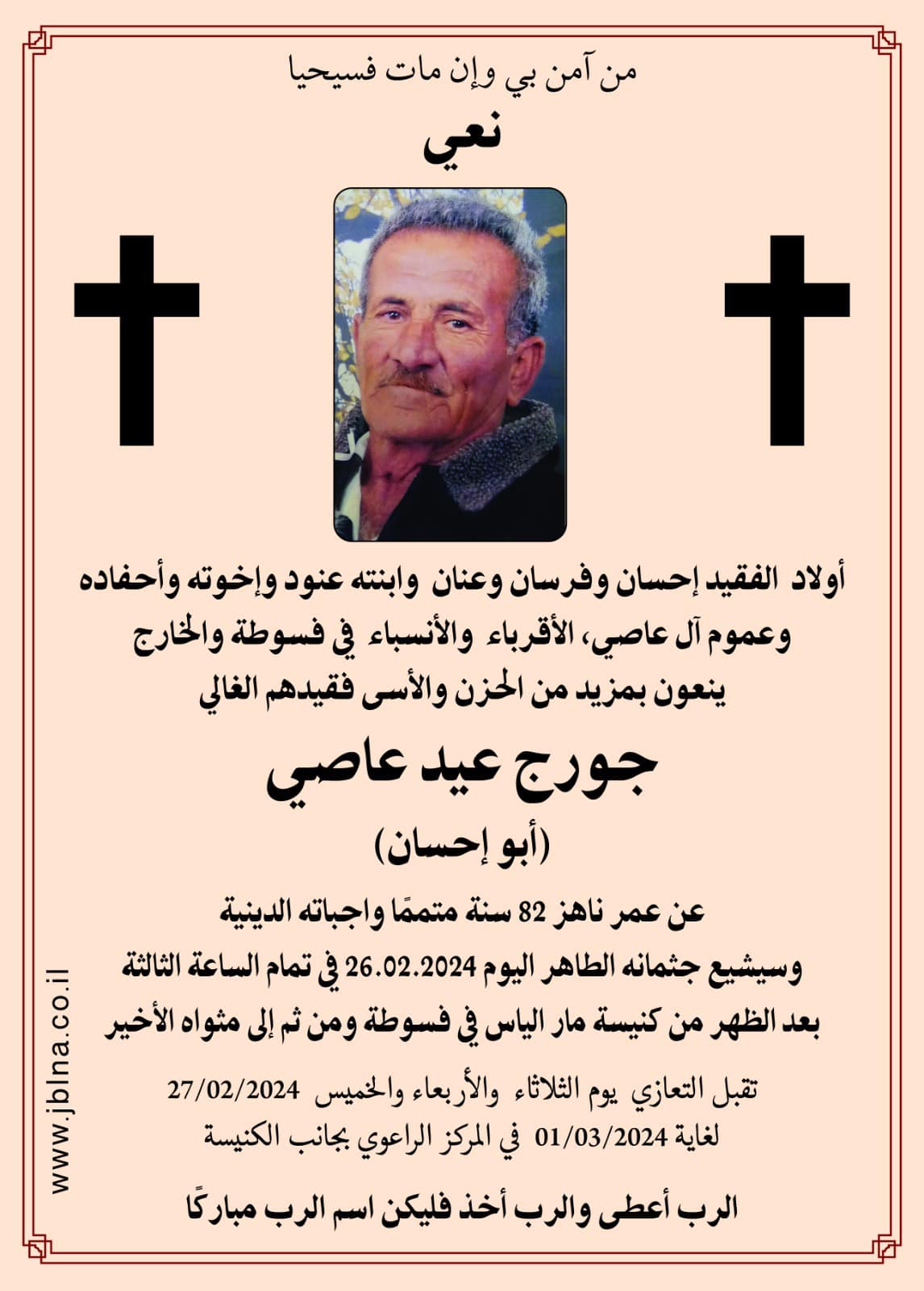 26 فبراير فسوطة- وفاة طيب الذكر جورج عيد عاصي- ابو احسان عن عمر ناهز 82 سنة من طرف : مصادر اخرى 2024-02-26 وفيات فسوطة- وفاة طيب الذكر جورج عيد عاصي- ابو احسان عن عمر ناهز 82 سنة