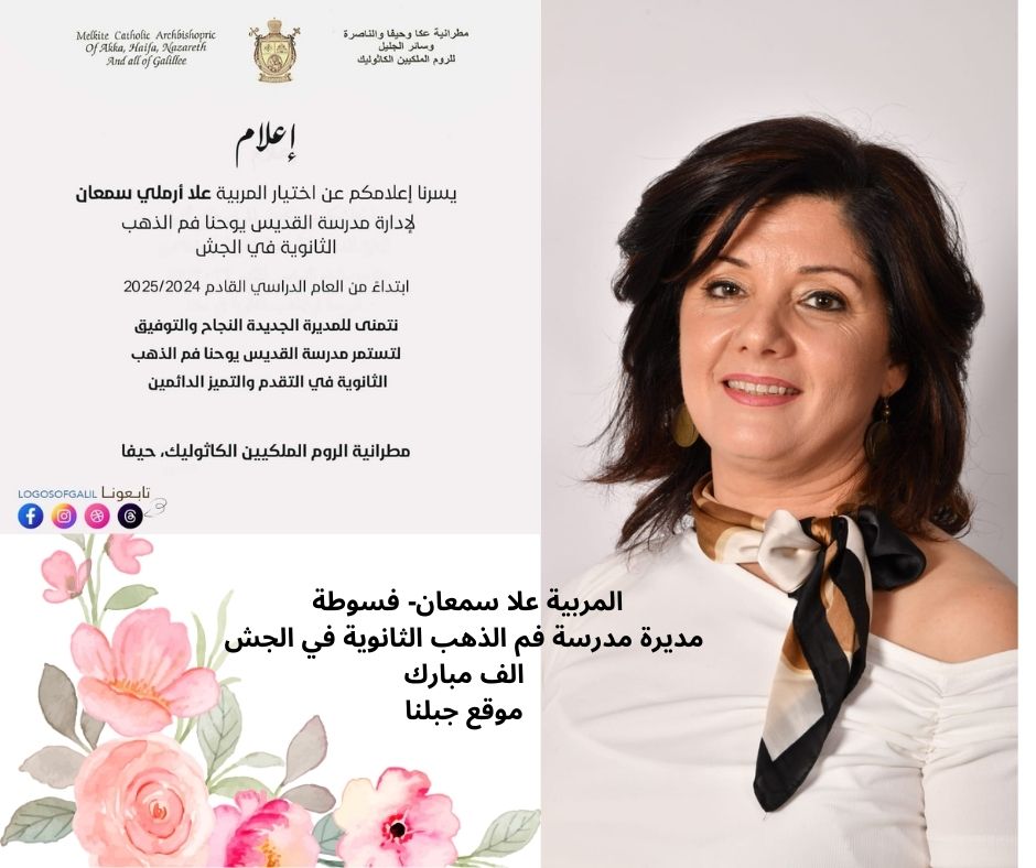 تعيين المربية علا رفعت ارملي سمعان (45) من فسوطة- مديرة مدرسة يوحنا فم الذهب الثانوية في الجش ابتداءً من العام الدراسي المقبل