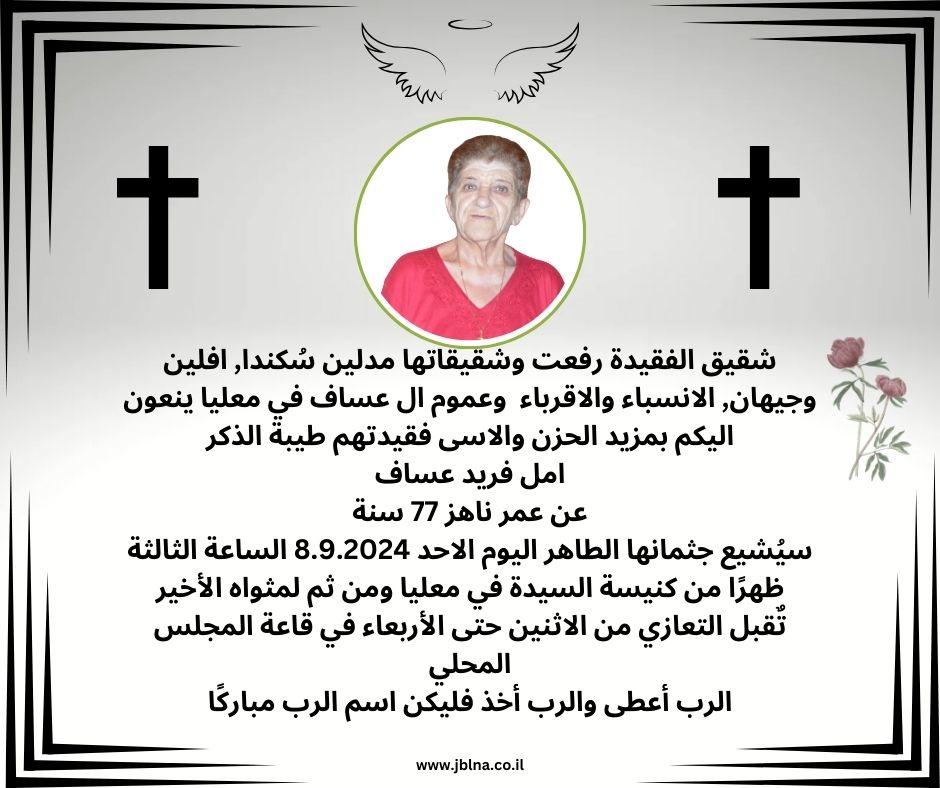 08 سبتمبر معليا- وفاة طيبة القلب امل فريد عساف عن عمر 77 سنة من طرف : مصادر اخرى 2024-09-08 وفيات معليا- وفاة طيبة القلب امل فريد عساف عن عمر 77 سنة