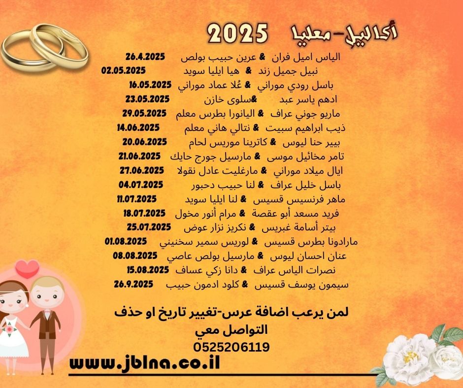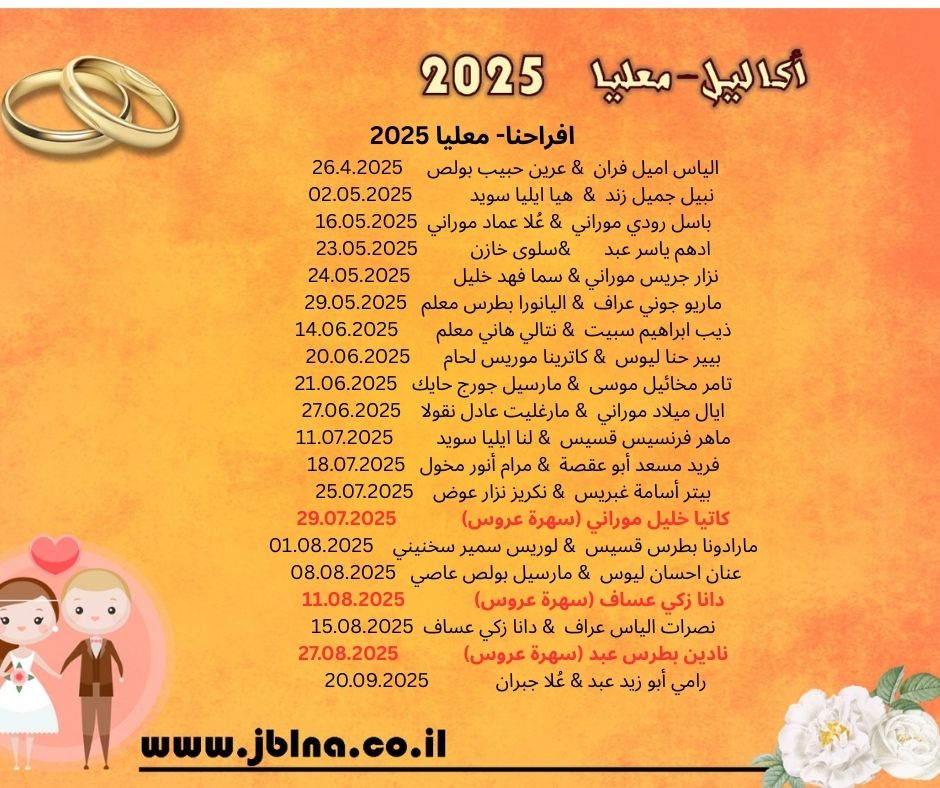 كما عودتكم مع مطلع شهر الميلاد كل سنة أن اعرض لكم قائمة الافراح والمناسبات السعيدة في المنطقة, واليكم قائمة الافراح لسنة 2025 بعد أن تواصلت مع جميع الجهات المتصلة بالموضوع...