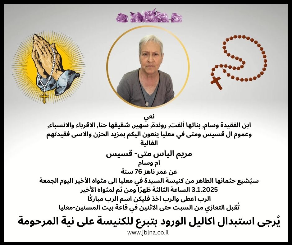 03 يناير معليا- وفاة طيبة الذكر مريم الياس متى قسيس- ام وسام 76 سنة من طرف : مصادر اخرى 2025-01-03 وفيات معليا- وفاة طيبة الذكر مريم الياس متى قسيس- ام وسام 76 سنة